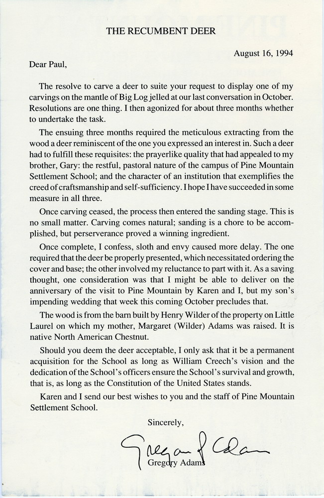 Should you deem the [carved chestnut] deer acceptable, I only ask that it be a permanent acquisition for the School as long as William Creech’s vision and the dedication of the School’s officers ensure the School’s survival and growth…. – Gregory Adams, wood carver.