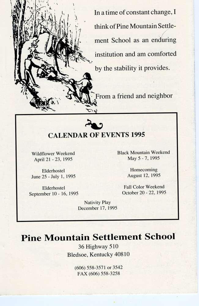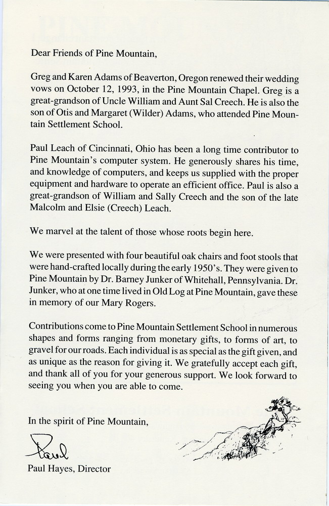 Karen and I send our best wishes to you and the staff of Pine Mountain Settlement School.
