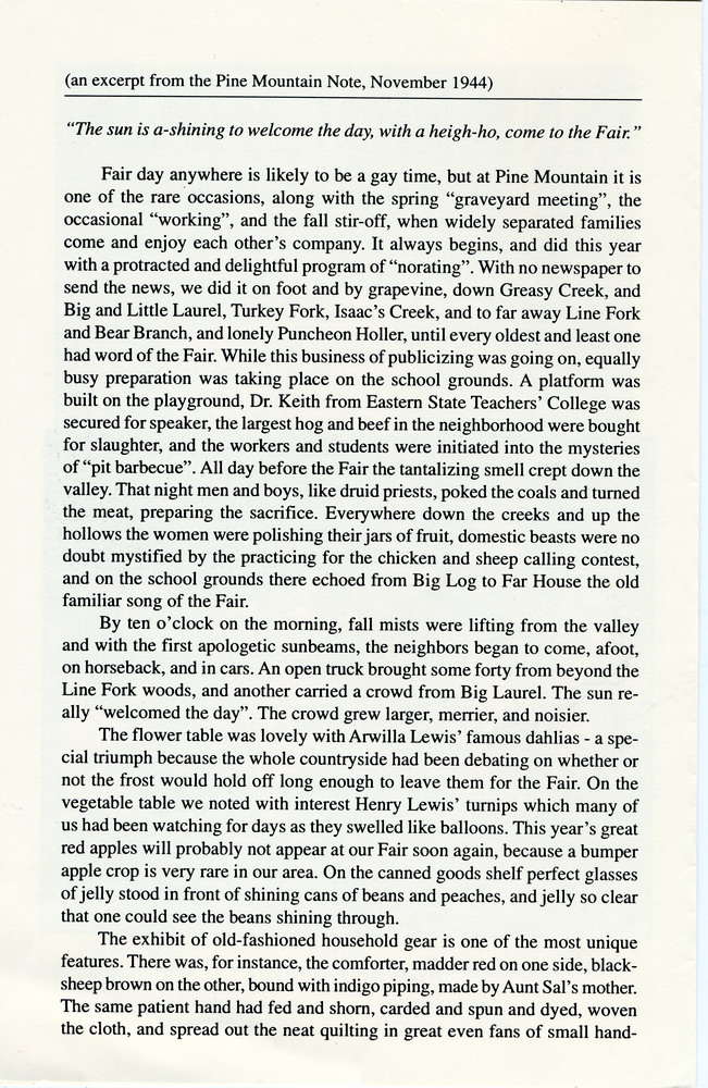 Fair day anywhere is likely to be a gay time, but at Pine Mountain it is one of the rare occasions, along with the spring “graveyard meeting”, the occasional “working”, and the fall stir-off, when widely separated families come and enjoy each other’s company. It always begins, and did this year with a protracted and delightful program of “norating”. With no newspaper to send the news, we did it on foot and by grapevine, down Greasy Creek, and Big and Little Laurel, Turkey Fork, Isaac’s Creek, and to far away Line Fork and Bear Branch, and lonely Puncheon Holler, until every oldest and least one had word of the Fair. While this business of publicizing was going on, equally busy preparation was taking place on the school grounds. A platform was built on the playground, Dr. Keith from Eastern State Teachers’ College was secured for speaker, the largest hog and beef in the neighborhood were bought for slaughter, and the workers and students were initiated into the mysteries of “pit barbecue”. All day before the Fair the tantalizing smell crept down the valley. That night men and boys, like druid priests, poked the coals and turned the meat, preparing the sacrifice. Everywhere down the creeks and up the hollows the women were polishing their jars of fruit, domestic beasts were no doubt mystified by the practicing for the chicken and sheep calling contest, and on the school grounds there echoed from Big Log to Far House the old familiar song of the Fair.