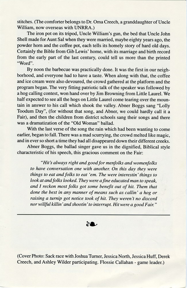 “Hit’s always right and good for menfolks and womenfolks to have conversation one with another. On this day they were things to eat and folks to eat ’em. [They] were interestin’ things to look at and folks looked. They were a fine educated man to speak, and I reckon most folks got some benefit out of hit. Them that done the best in any manner of means such as callin’ a hog or raising a turnip got notice took of hit. They weren’t no discord nor willful killin’ and shootin’ to interrupt. Hit were a good Fair.”