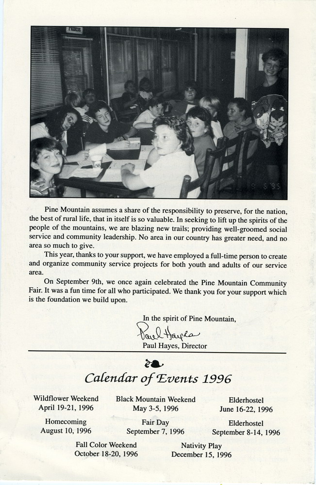 Pine Mountain assumes a share of the responsibility to preserve, for the nation, the best of rural life, that in itself is so valuable. In seeking to lift up the spirits of the people of the mountains, we are blazing new trails; providing well-groomed social service and community leadership. No area in our country has greater need, and no area so much to give.