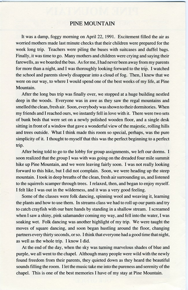 The next morning, when I got up, I knew but did not realize that we were going home. I had everything packed, and was ready to go. We ate our last breakfast in the lodge. Teachers took last minute head counts, and then we were heading outside, and put on the bus. I was talking to my friends, and not really paying attention to what was going on. Suddenly, the bus started moving, and I realized that were going away from Pine Mountain forever. I know that I will carry it’s [sic] wonderful memories with me for years to come. I can remember nearly everything about the place, and I can see how magical Pine Mountain really was to me.