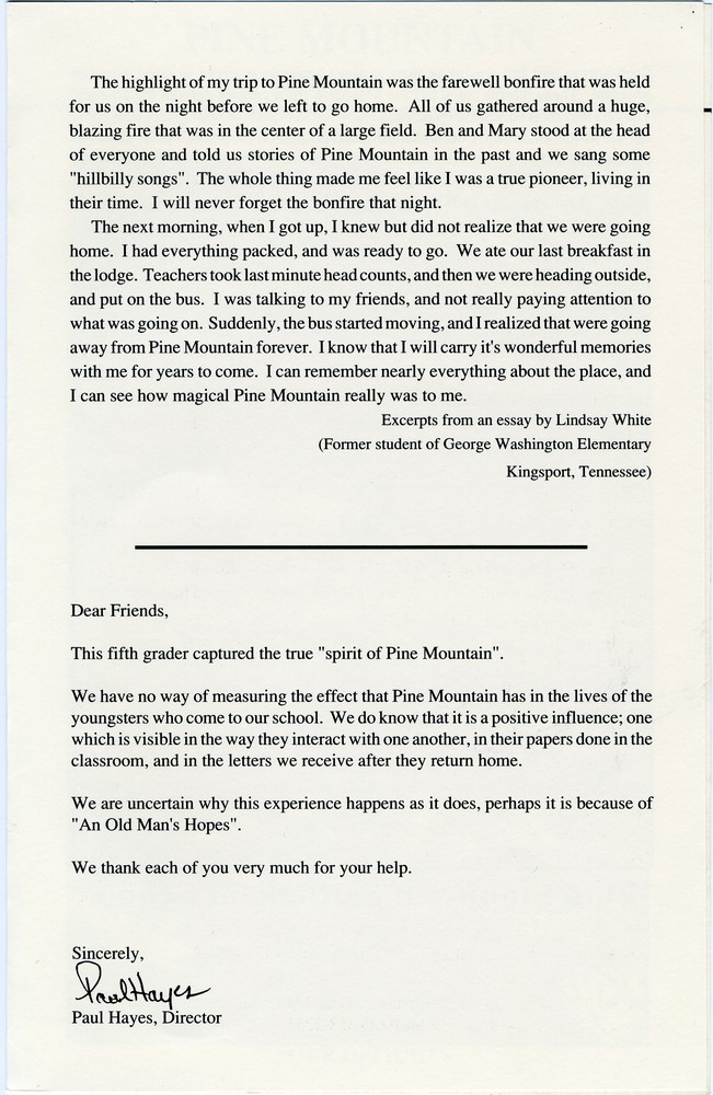 We have no way of measuring the effect that Pine Mountain has in the lives of the youngsters who come to our school. We do know that it is a positive influence; one which is visible in the way they interact with one another, in their papers done in the classroom, and in the letters we receive after they return home.
