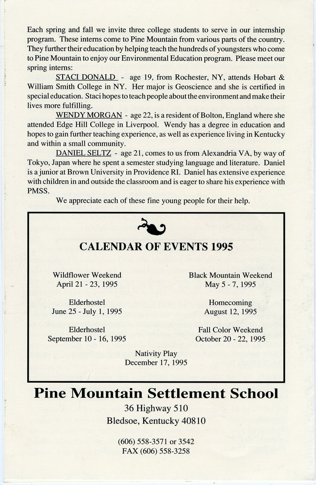 TAGS: NOTES – 1995 Spring, student essay, dormitories, school group, hiking, classes, dancing, Chapel, bonfire, songs, Lindsey White, interns, Staci Donald, Wendy Morgan, Daniel Seltz, photographs