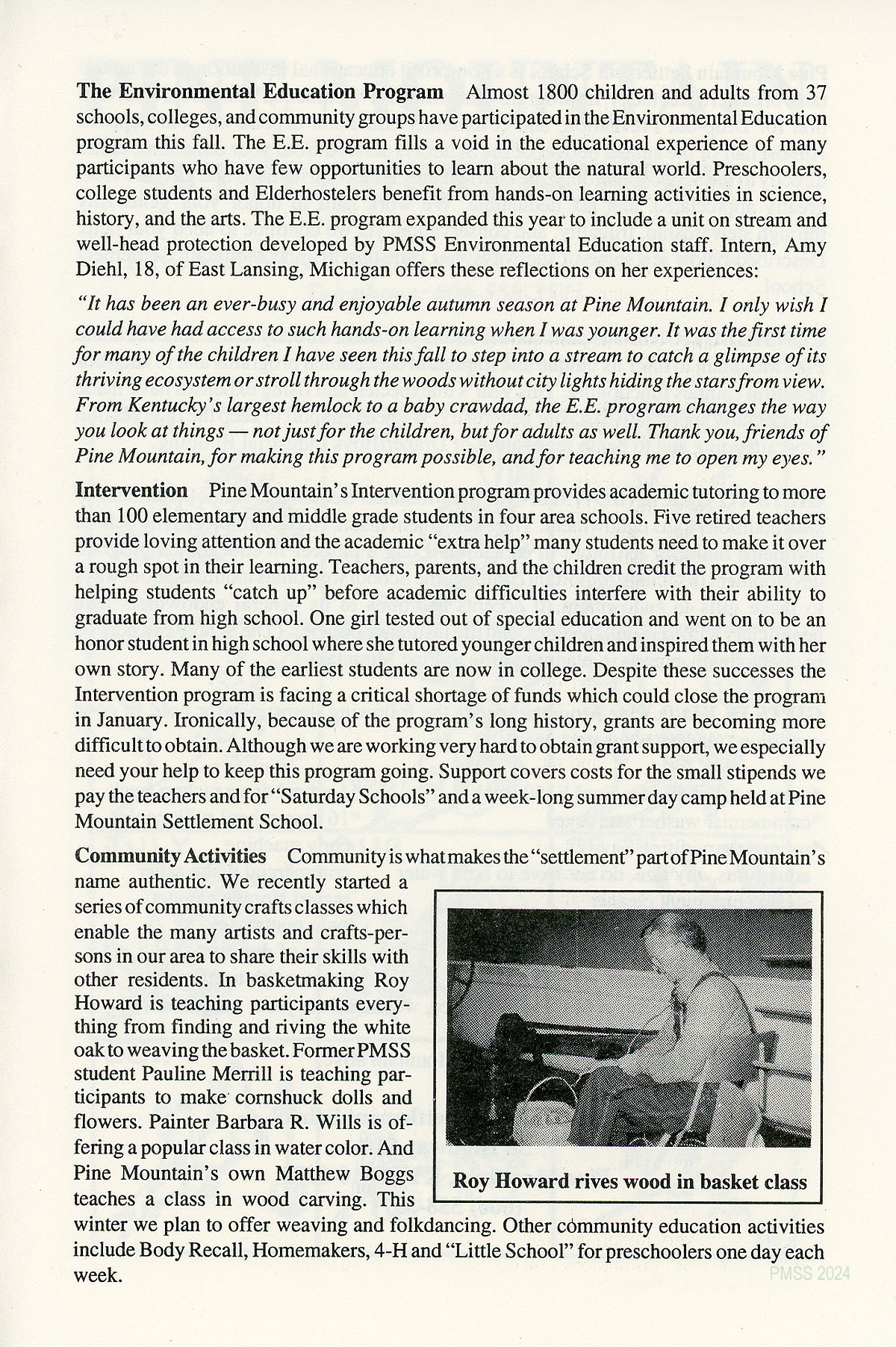 Community Activities Community is what makes the “settlement” part of Pine Mountain’s name authentic. We recently started a series of community crafts classes which enable the many artists and crafts-per- sons in our area to share their skills with other residents. In basketmaking Roy Howard is teaching participants everything from finding and riving the white oak to weaving the basket. Former PMSS student Pauline Merrill is teaching participants to make cornshuck dolls and flowers. Painter Barbara R. Wills is offering a popular class in water color. And Pine Mountain’s own Matthew Boggs teaches a class in wood carving. This winter we plan to offer weaving and folkdancing. Other community education activities include Body Recall, Homemakers, 4-H and “Little School” for preschoolers one day each week.
