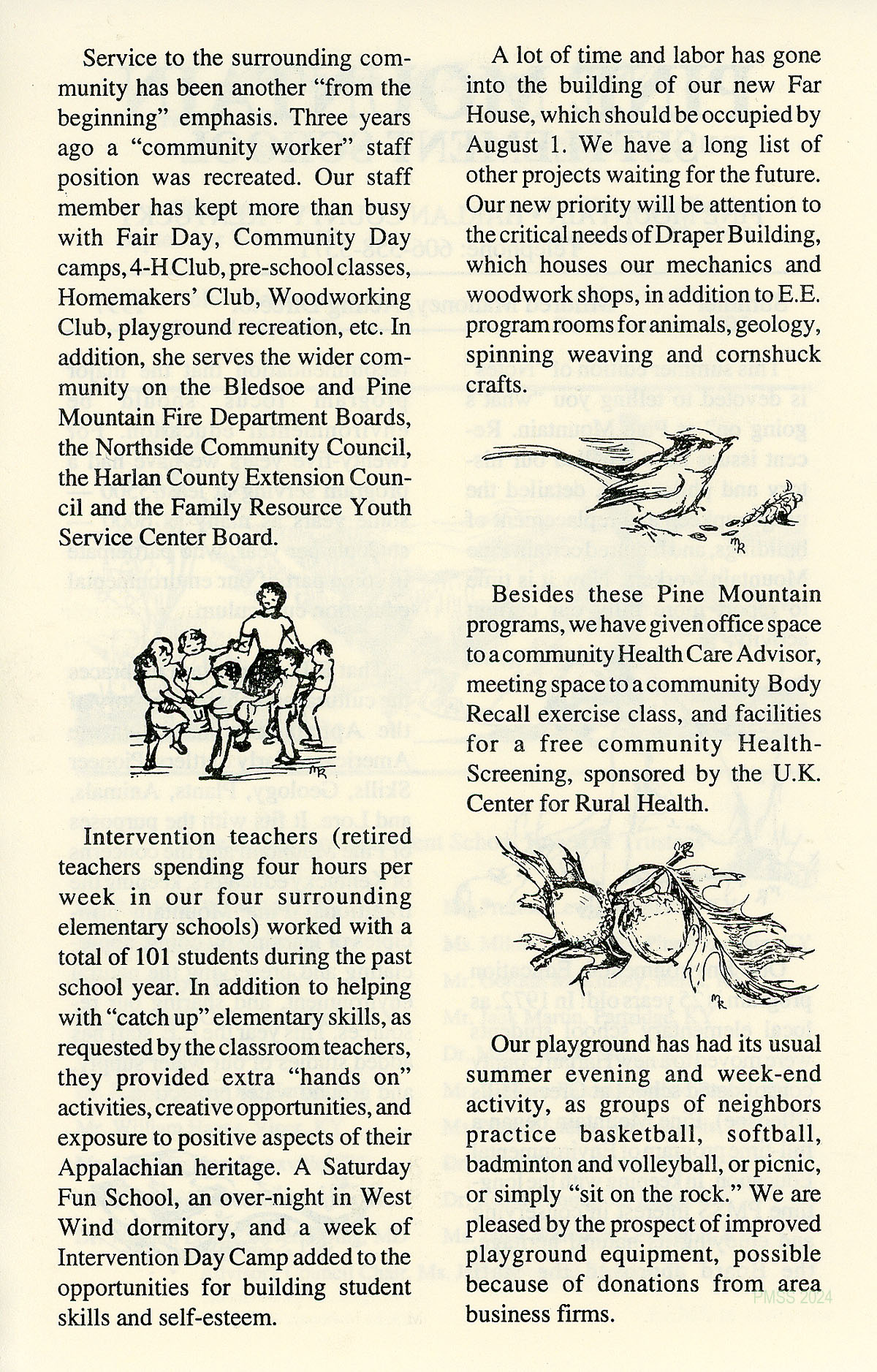 Service to the surrounding community has been another “from the beginning” emphasis. Three years ago a “community worker” staff position was recreated. Our staff member has kept more than busy with Fair Day, Community Day camps, 4-H Club, pre-school classes, Homemakers’ Club, Woodworking Club, playground recreation, etc. In addition, she serves the wider community on the Bledsoe and Pine Mountain Fire Department Boards, the Northside Community Council, the Harlan County Extension Council and the Family Resource Youth Service Center Board.
