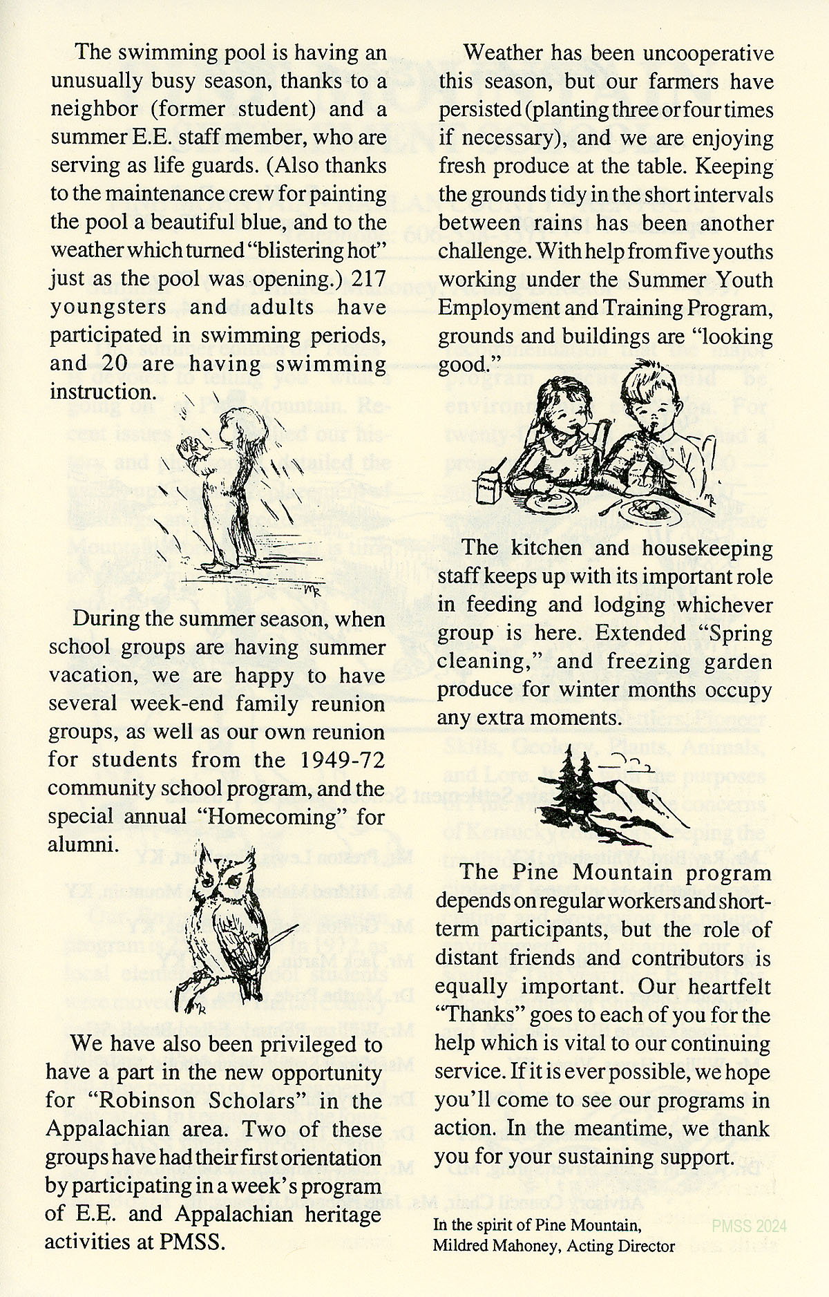The Pine Mountain program depends on regular workers and short-term participants, but the role of distant friends and contributors is equally important. Our heartfelt “Thanks” goes to each of you for the help which is vital to our continuing service. If it is ever possible, we hope you’ll come to see our programs in action. In the meantime, we thank you for your sustaining support.