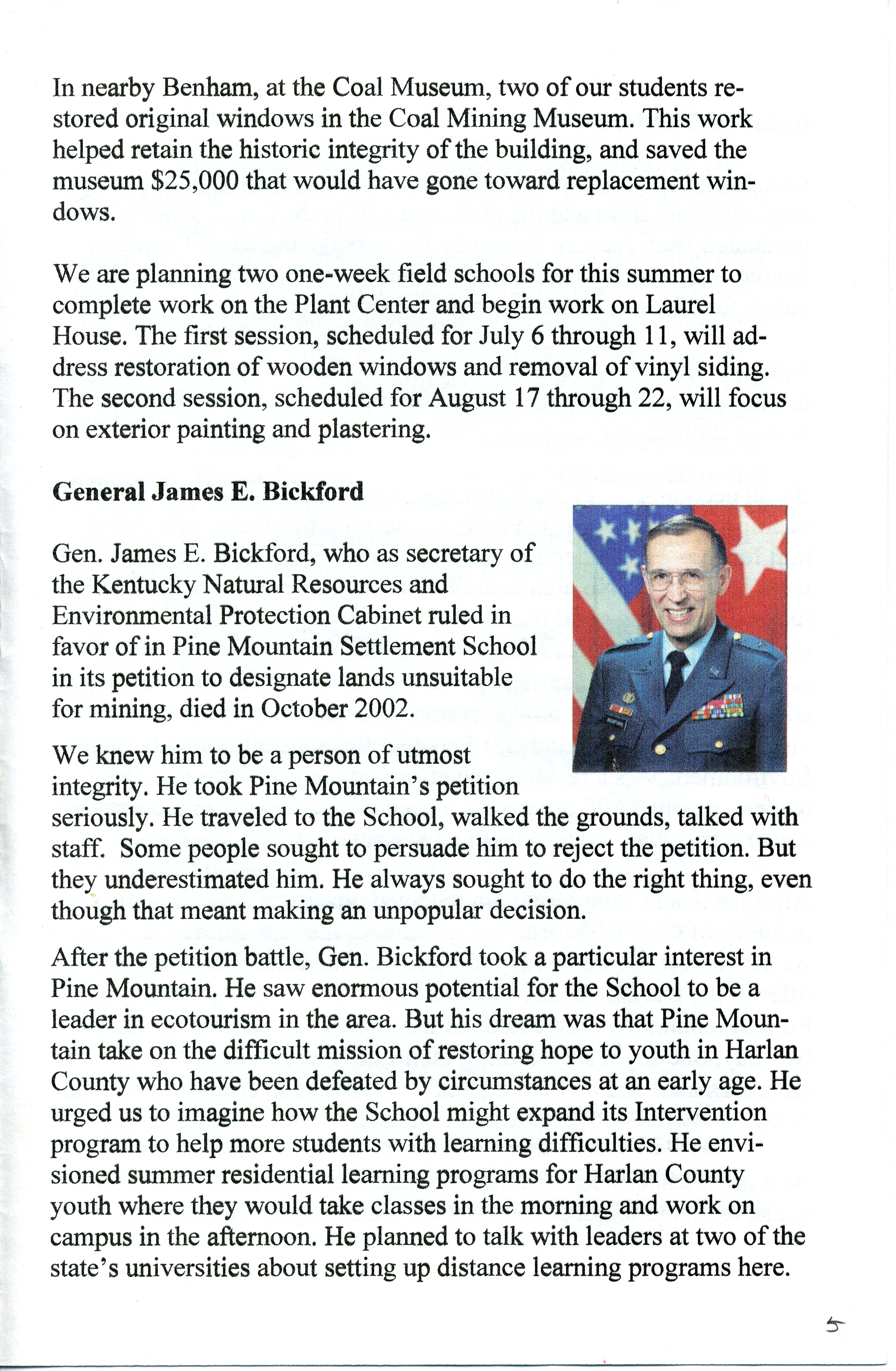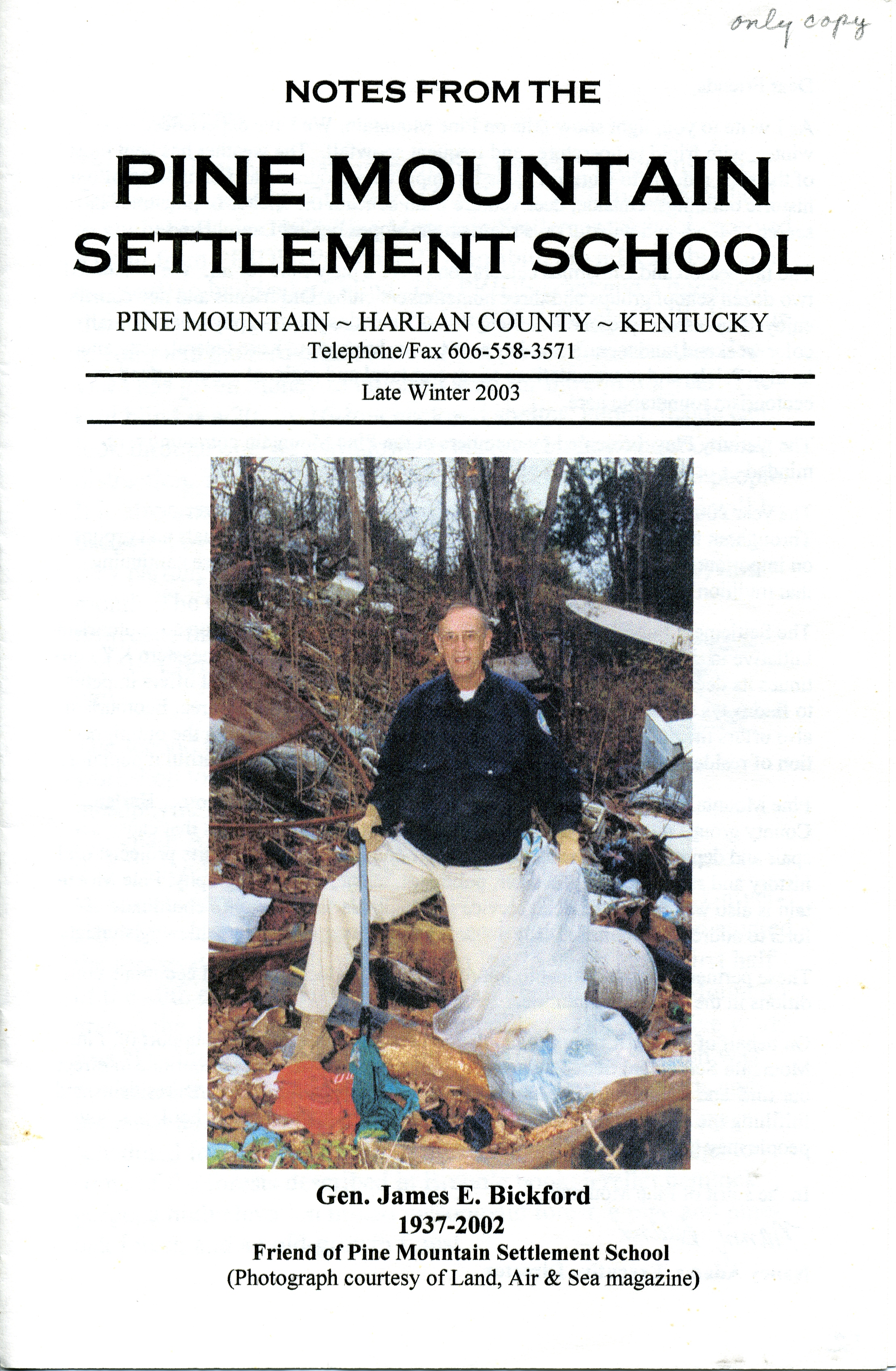 Gen. James E. Bickford, who as secretary of the Kentucky Natural Resources and Environmental Protection Cabinet ruled in favor of in Pine Mountain Settlement School in its petition to designate lands unsuitable for mining, died in October 2002.