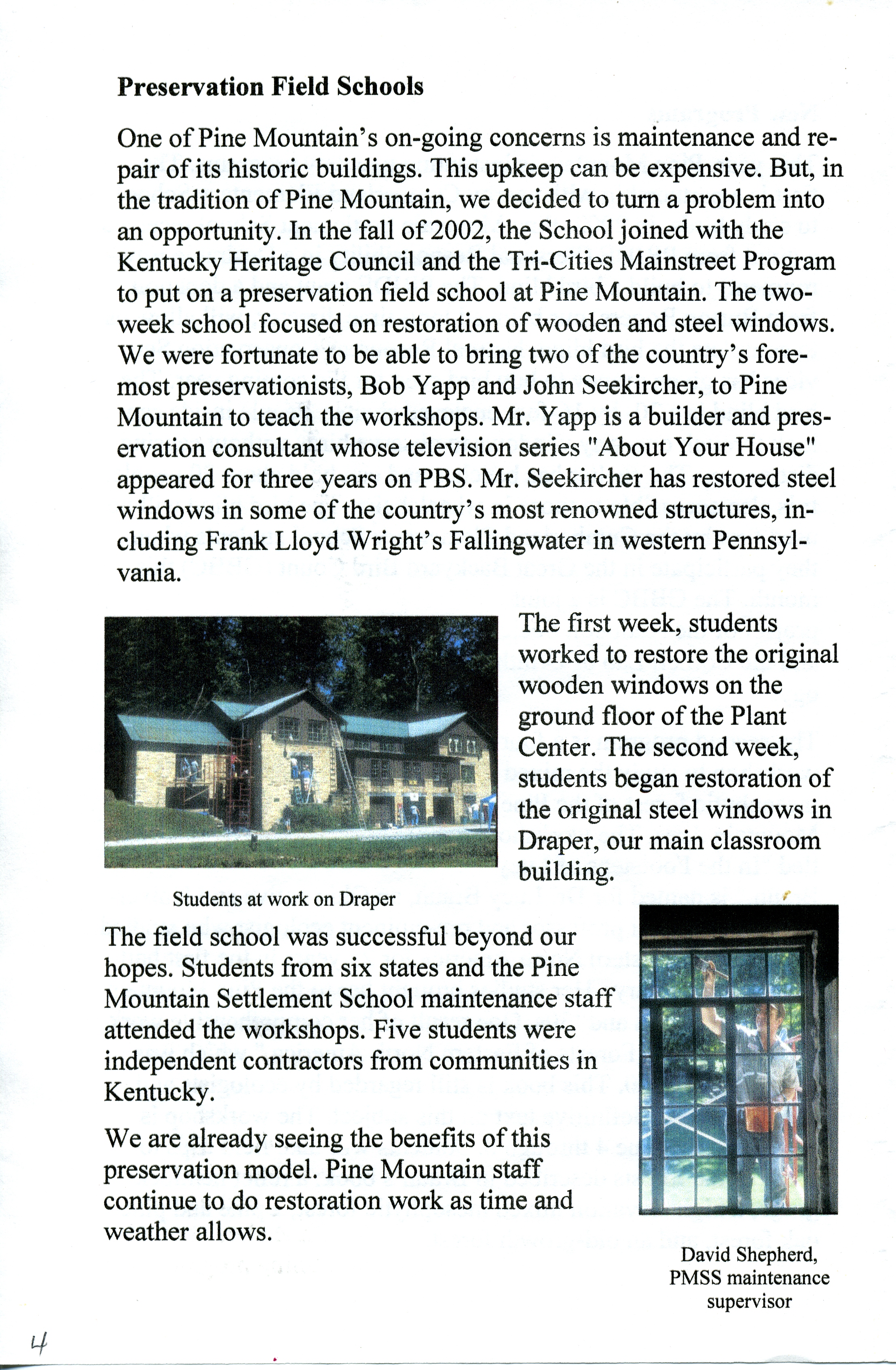 One of Pine Mountain’s on-going concerns is maintenance and repair of its historic buildings. This upkeep can be expensive. But, in the tradition of Pine Mountain, we decided to turn a problem into an opportunity. In the fall of 2002, the School joined with the Kentucky Heritage Council and the Tri-Cities Mainstreet Program to put on a preservation field school at Pine Mountain. The two- week school focused on restoration of wooden and steel windows. We were fortunate to be able to bring two of the country’s foremost preservationists, Bob Yapp and John Seekircher, to Pine Mountain to teach the workshops. Mr. Yapp is a builder and preservation consultant whose television series “About Your House” appeared for three years on PBS. Mr. Seekircher has restored steel windows in some of the country’s most renowned structures, including Frank Lloyd Wright’s Fallingwater in western Pennsylvania.