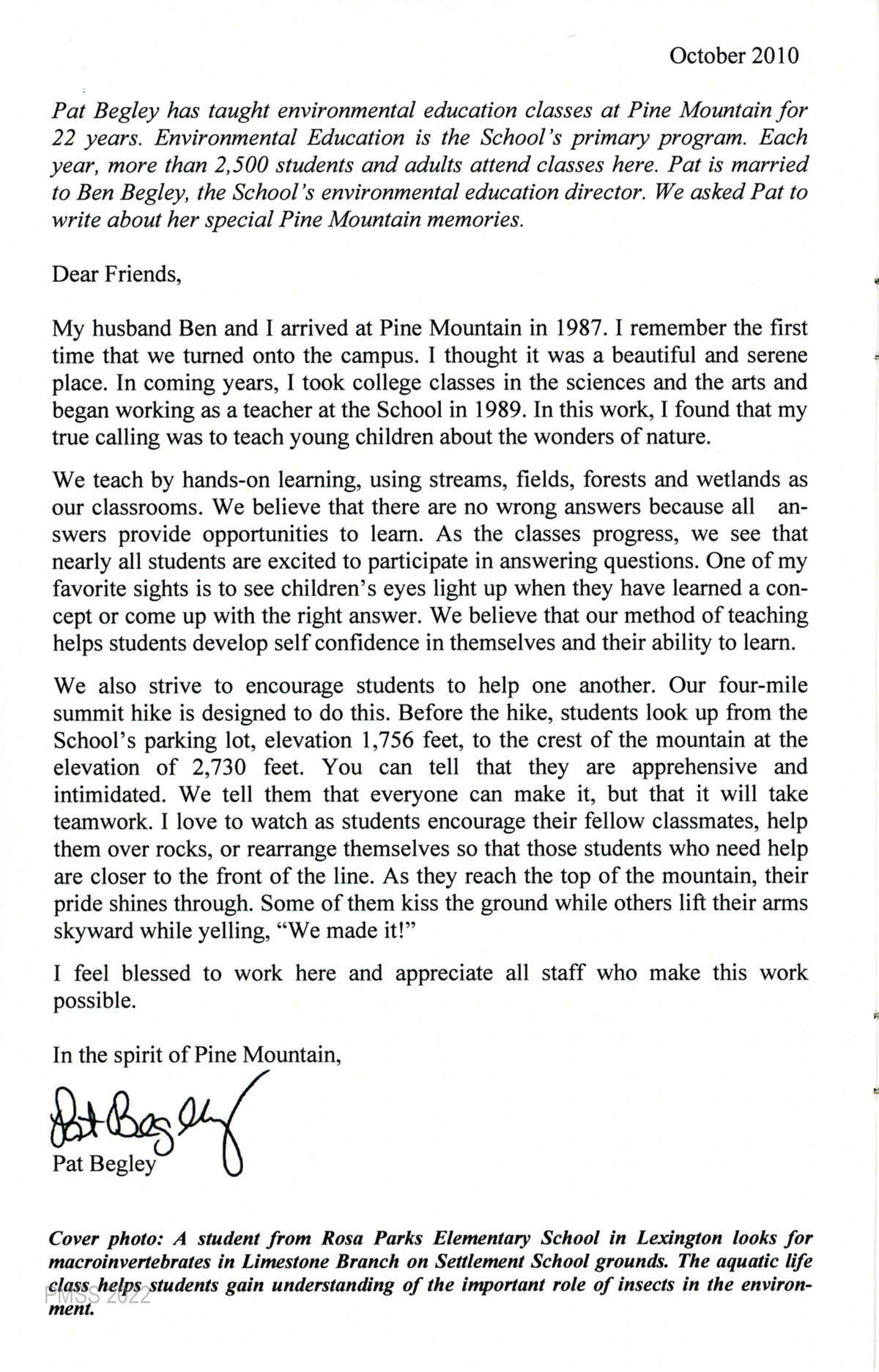 Pat Begley has taught environmental education classes at Pine Mountain for 22 years. Environmental Education is the School’s primary program. Each year, more than 2,500 students and adults attend classes here. Pat is married to Ben Begley, the School’s environmental education director. We asked Pat to write about her special Pine Mountain memories.