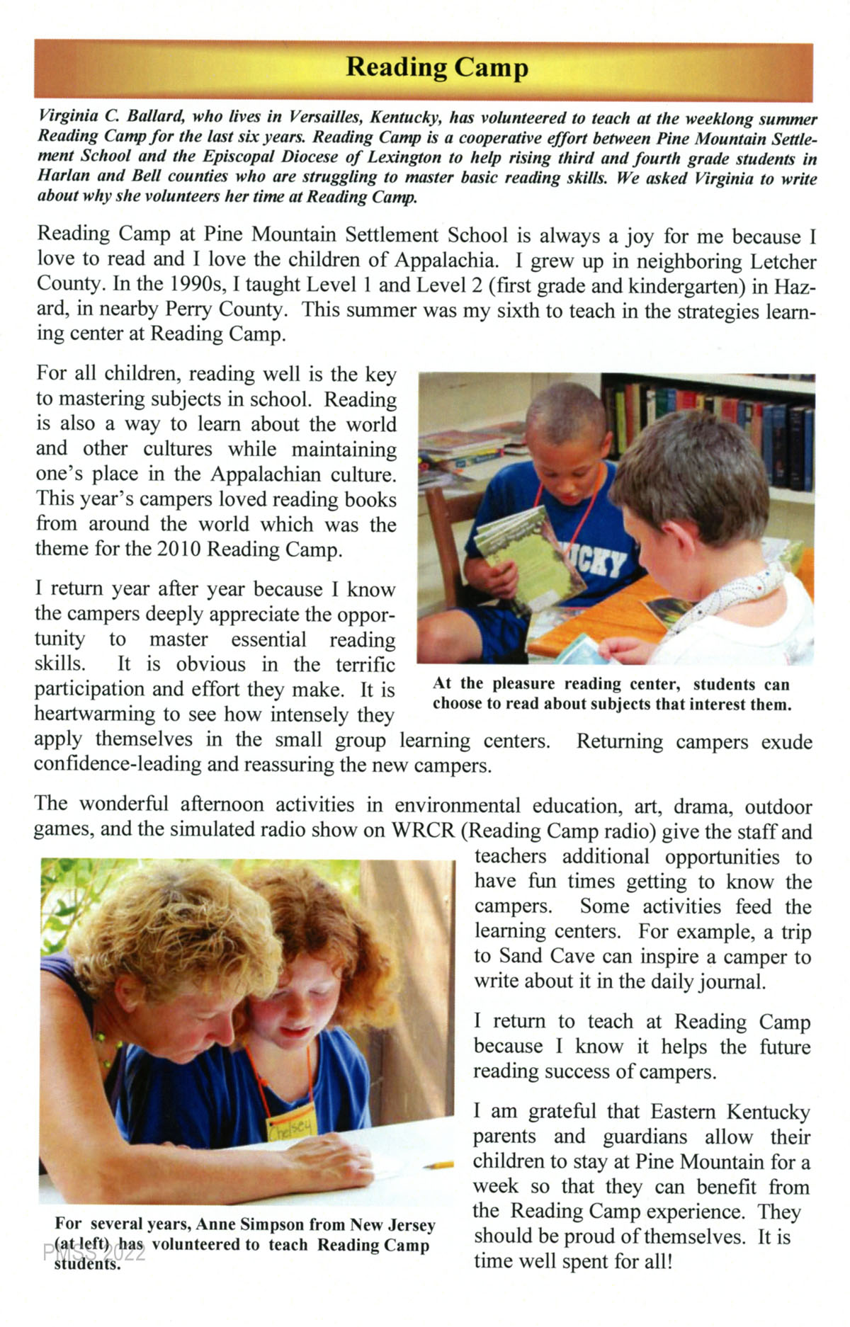 Virginia C. Ballard, who lives in Versailles, Kentucky, has volunteered to teach at the weeklong summer Reading Camp for the last six years. Reading Camp is a cooperative effort between Pine Mountain Settlement School and the Episcopal Diocese of Lexington to help rising third and fourth grade students in Harlan and Bell counties who are struggling to master basic reading skills. We asked Virginia to write about why she volunteers her time at Reading Camp.