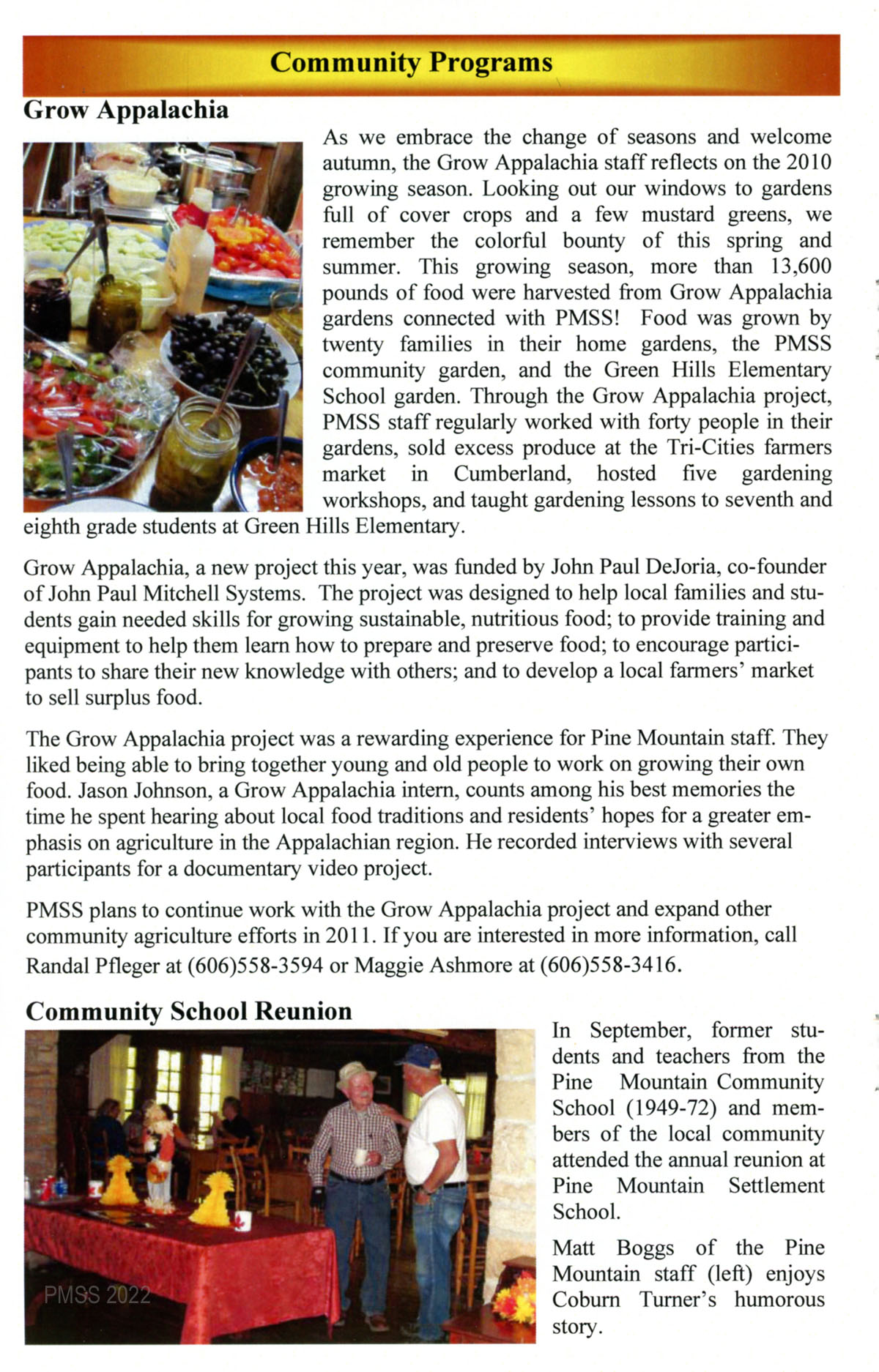 PMSS plans to continue work with the Grow Appalachia project and expand other community agriculture efforts in 2011. If you are interested in more information, call Randal Pfleger at (606)558-3594 or Maggie Ashmore at (606)558-3416.
