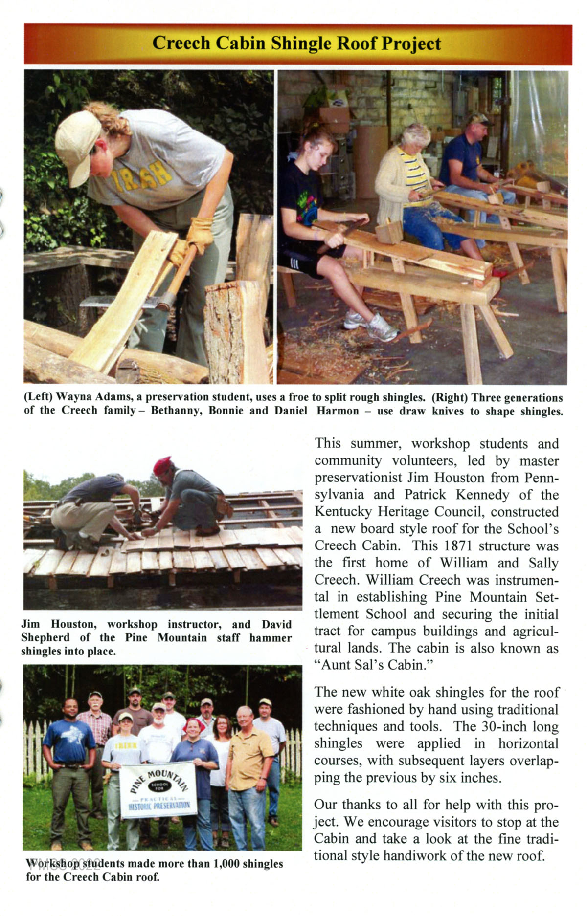 [Photograph: “Workshop students made more than 1,000 shingles for the Creech Cabin roof.”]