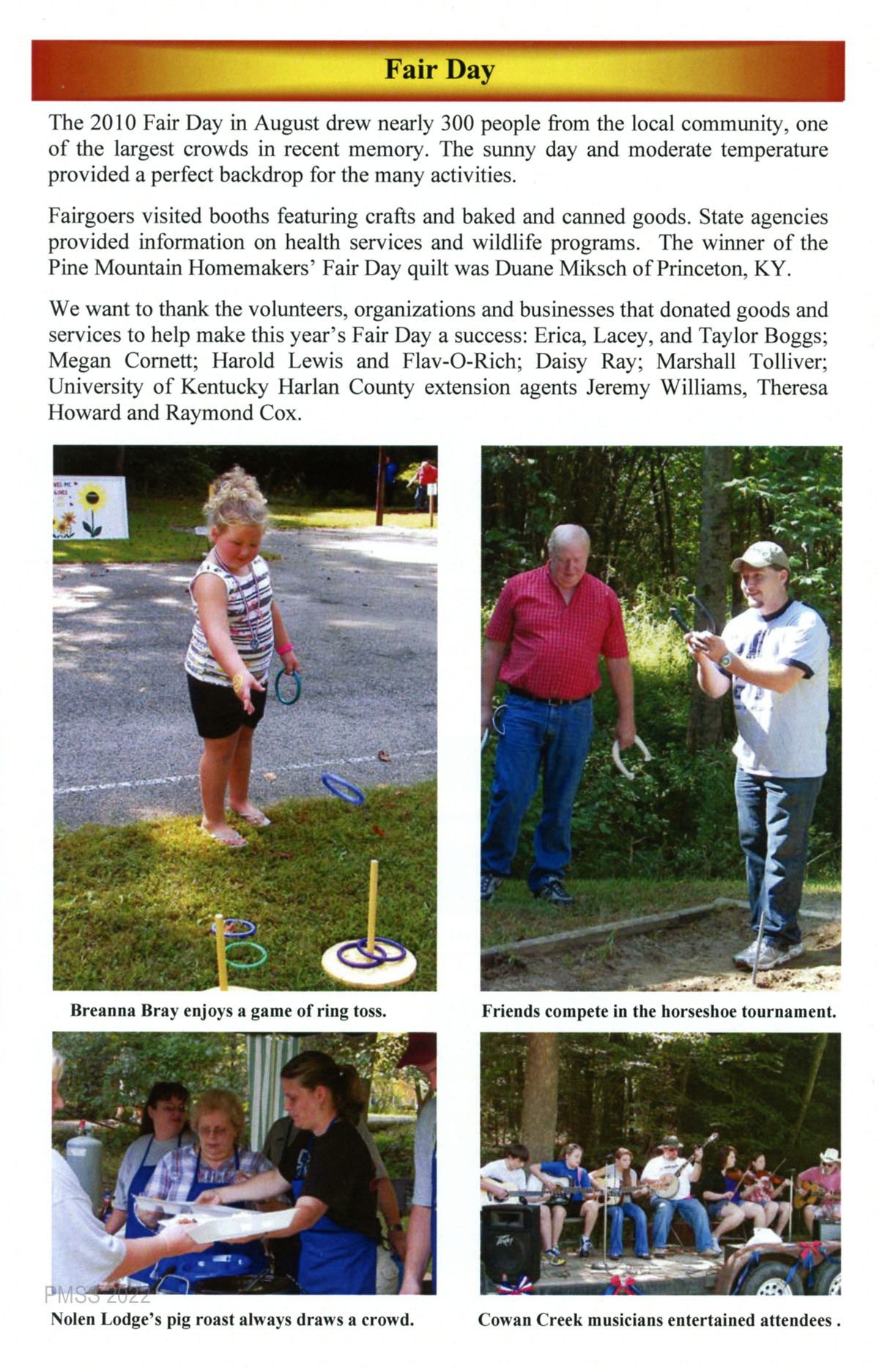 The 2010 Fair Day in August drew nearly 300 people from the local community, one of the largest crowds in recent memory. The sunny day and moderate temperature provided a perfect backdrop for the many activities.