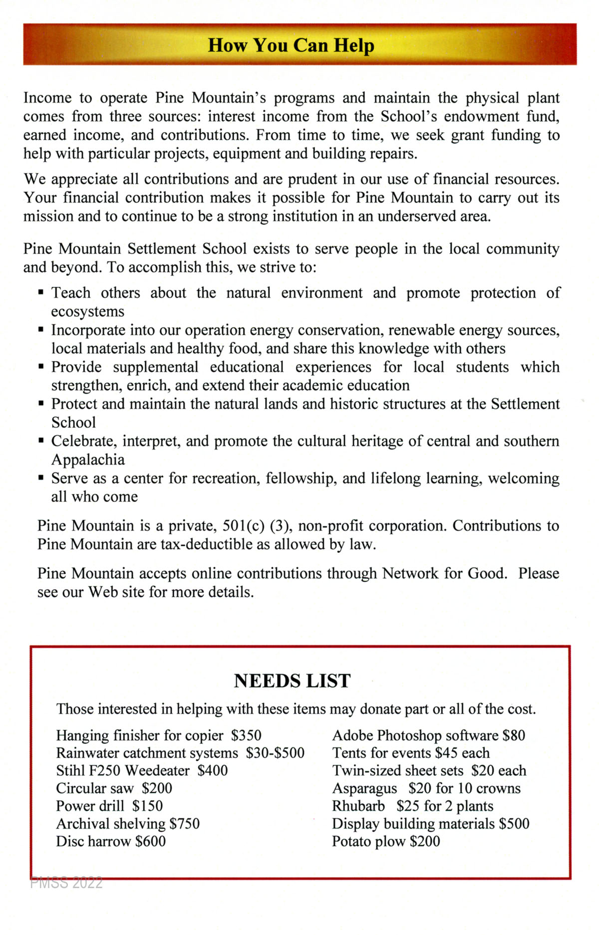 You may also write to: Operations Manager, Pine Mountain Settlement School, 36 HWY 510, Pine Mountain, KY 40810-8289 or e-mail: office@pinemountainsettlementschool.com.
