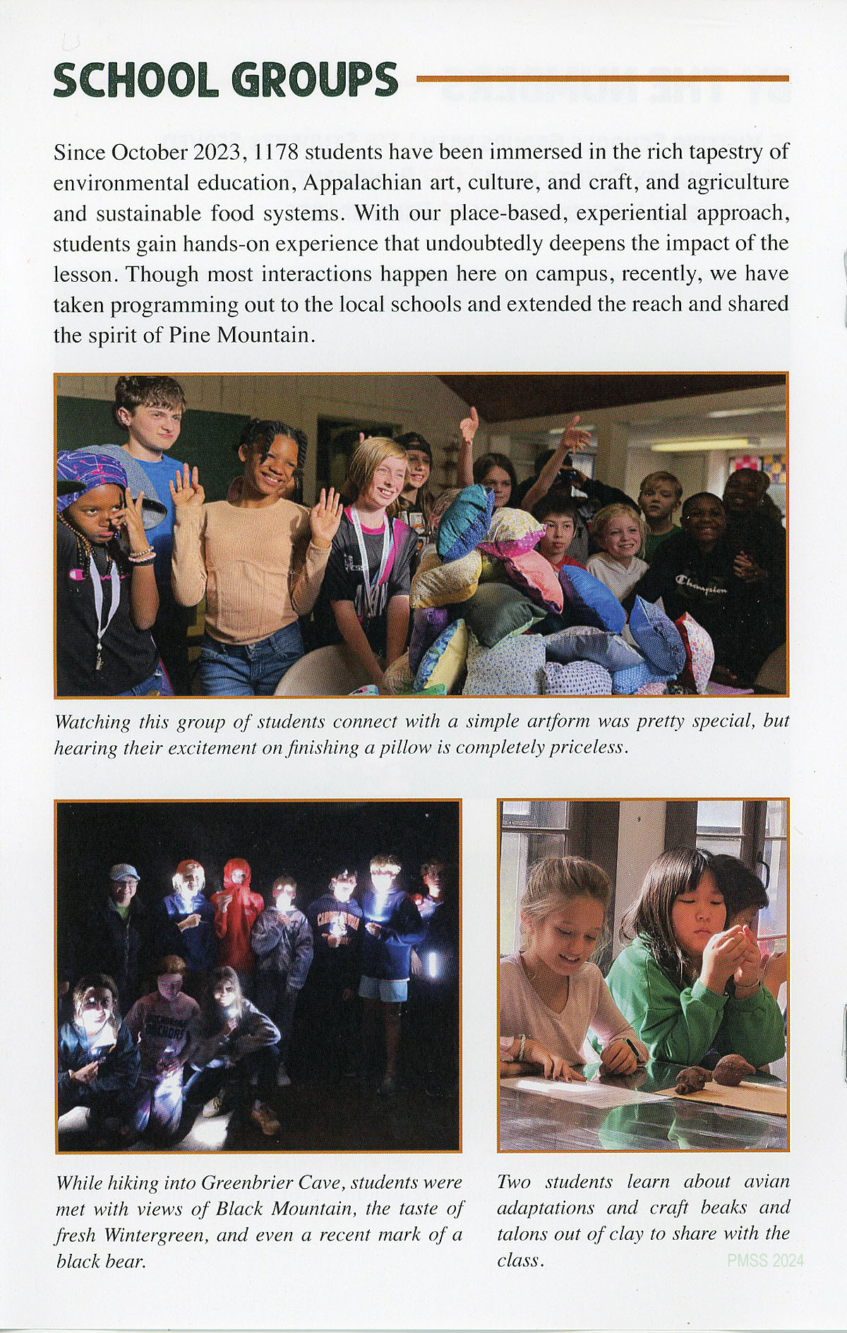 Since October 2023, 1178 students have been immersed in the rich tapestry of environmental education, Appalachian art, culture, and craft, and agriculture and sustainable food systems. With our place-based, experiential approach, students gain hands-on experience that undoubtedly deepens the impact of the lesson. Though most interactions happen here on campus, recently, we have taken programming out to the local schools and extended the reach and shared the spirit of Pine Mountain.