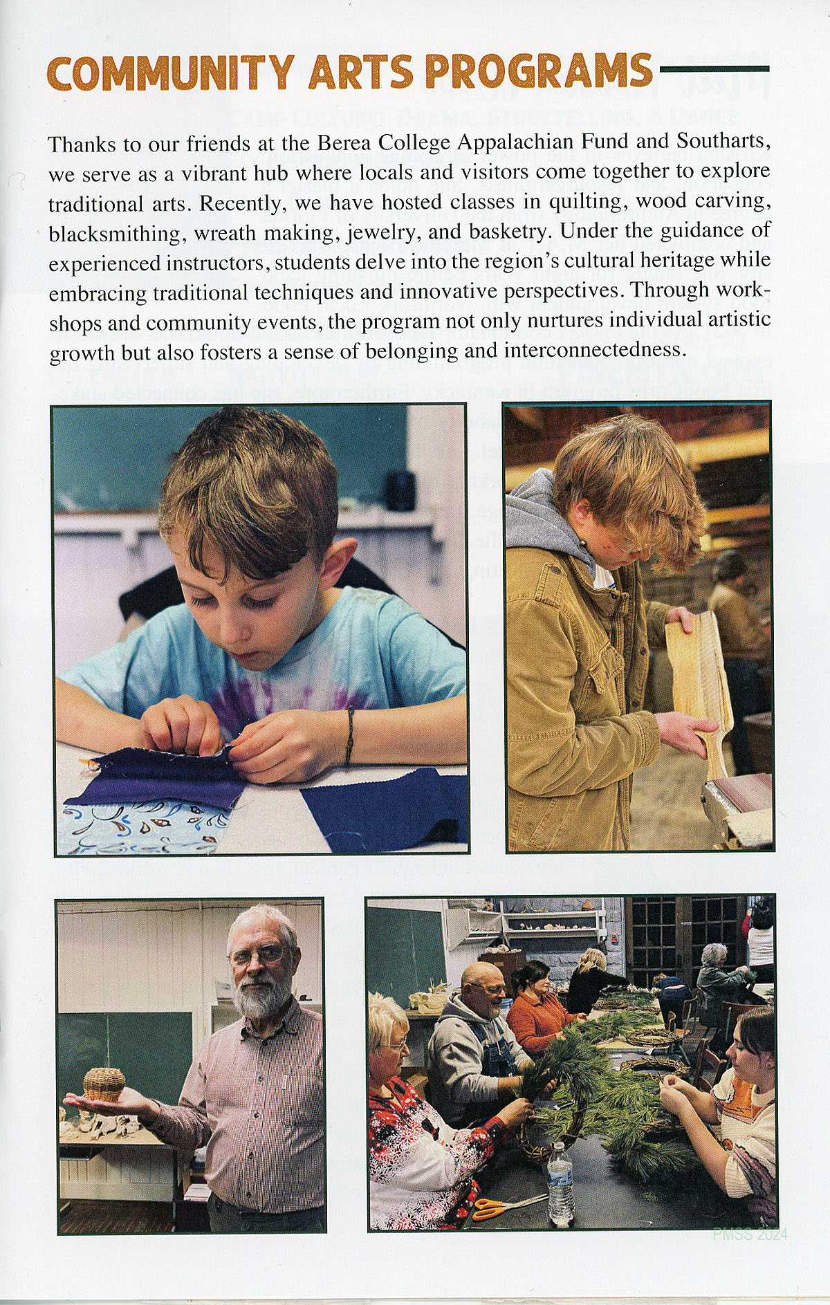Thanks to our friends at the Berea College Appalachian Fund and Southarts, we serve as a vibrant hub where locals and visitors come together to explore traditional arts. Recently, we have hosted classes in quilting, wood carving, blacksmithing, wreath making, jewelry, and basketry. Under the guidance of experienced instructors, students delve into the region’s cultural heritage while embracing traditional techniques and innovative perspectives. Through workshops and community events, the program not only nurtures individual artistic growth but also fosters a sense of belonging and interconnectedness.