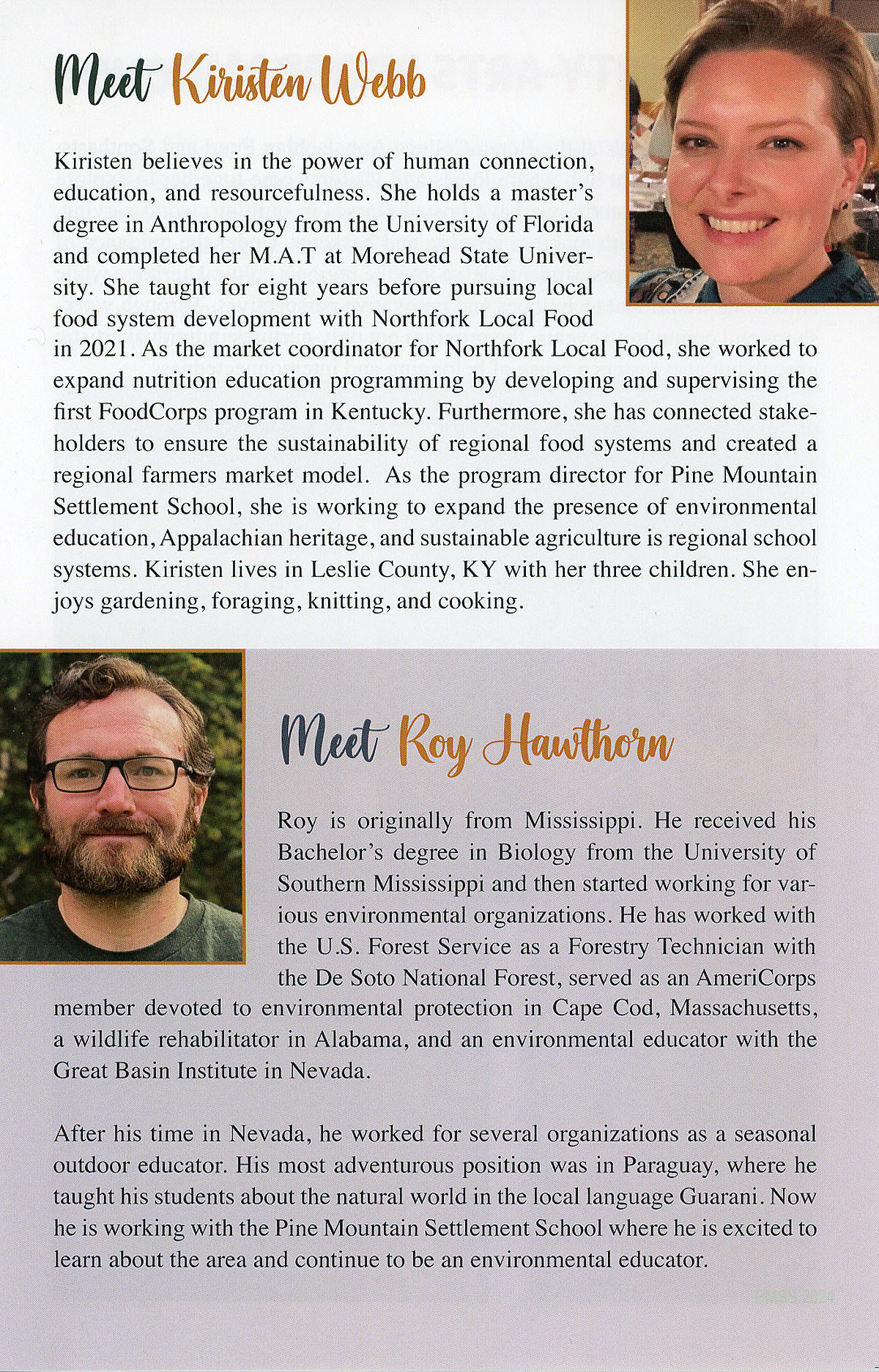 in 2021. As the market coordinator for Northfork Local Food, she worked to expand nutrition education programming by developing and supervising the first FoodCorps program in Kentucky. Furthermore, she has connected stakeholders to ensure the sustainability of regional food systems and created a regional farmers market model. As the program director for Pine Mountain Settlement School, she is working to expand the presence of environmental education, Appalachian heritage, and sustainable agriculture is regional school systems. Kiristen lives in Leslie County, KY with her three children. She enjoys gardening, foraging, knitting, and cooking.