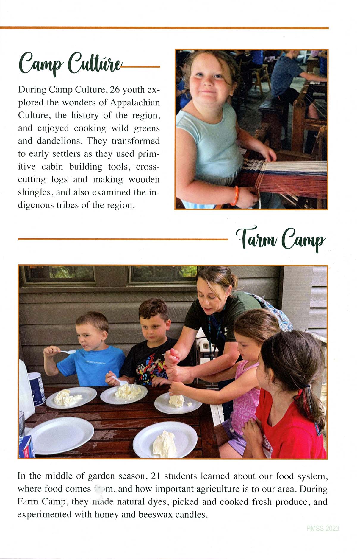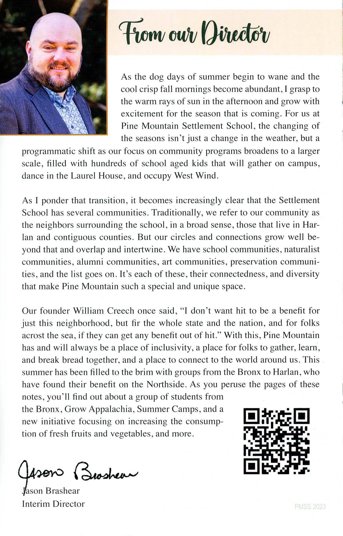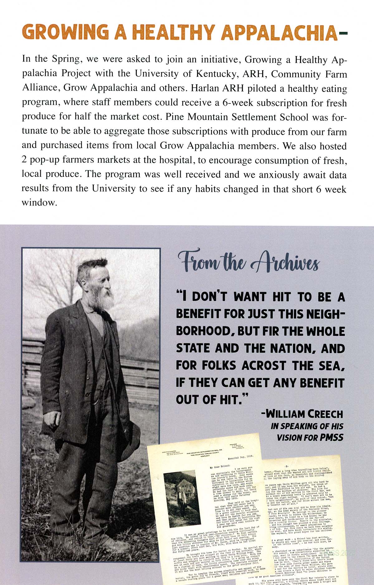 Our founder William Creech once said, “I don’t want hit to be a benefit for just this neighborhood, but fir the whole state and the nation, and for folks acrost the sea, if they can get any benefit out of hit.” With this, Pine Mountain has and will always be a place of inclusivity, a place for folks to gather, learn, and break bread together, and a place to connect to the world around us. This summer has been filled to the brim with groups from the Bronx to Harlan, who have found their benefit on the Northside. As you peruse the pages of these notes, you’ll find..out about a group of students from the Bronx, Grow Appalachia, Summer Camps, and a new initiative focusing on increasing the consumption of fresh fruits and vegetables, and more.