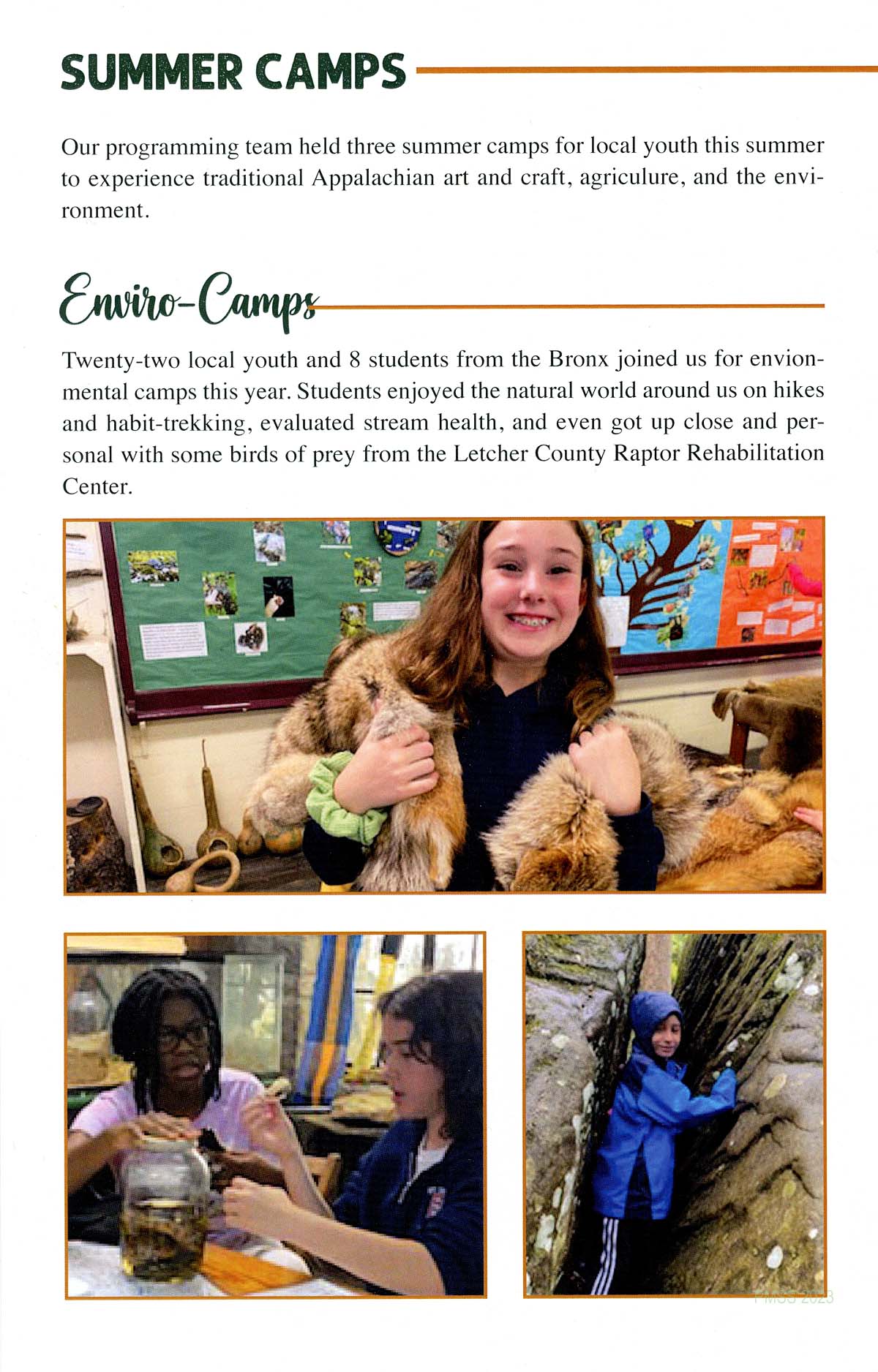 Twenty-two local youth and 8 students from the Bronx joined us for envionmental camps this year. Students enjoyed the natural world around us on hikes and habit-trekking, evaluated stream health, and even got up close and personal with some birds of prey from the Letcher County Raptor Rehabilitation Center.