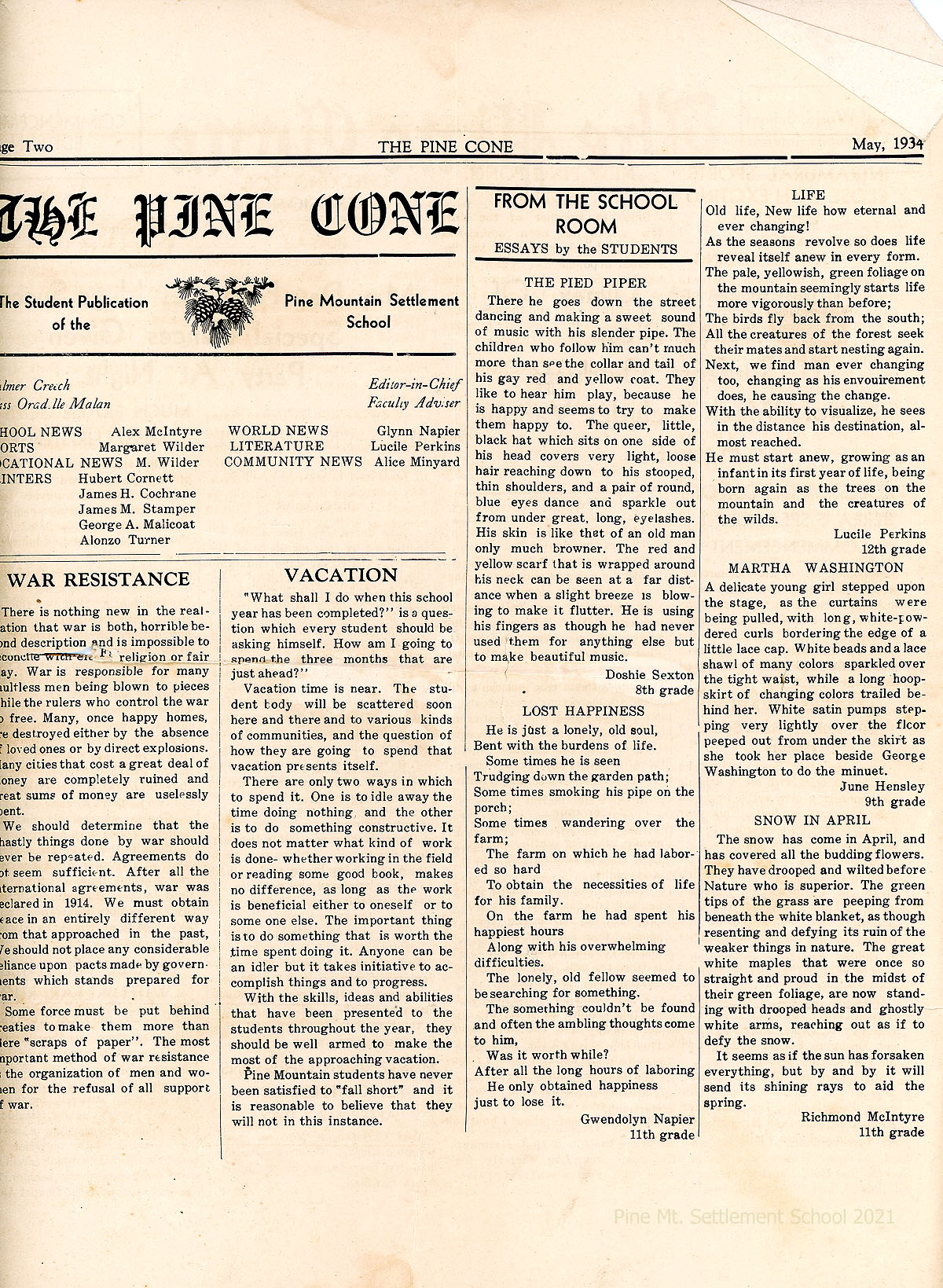 Printed and Published Monthly by the Students of Pine Mountain Settlement School