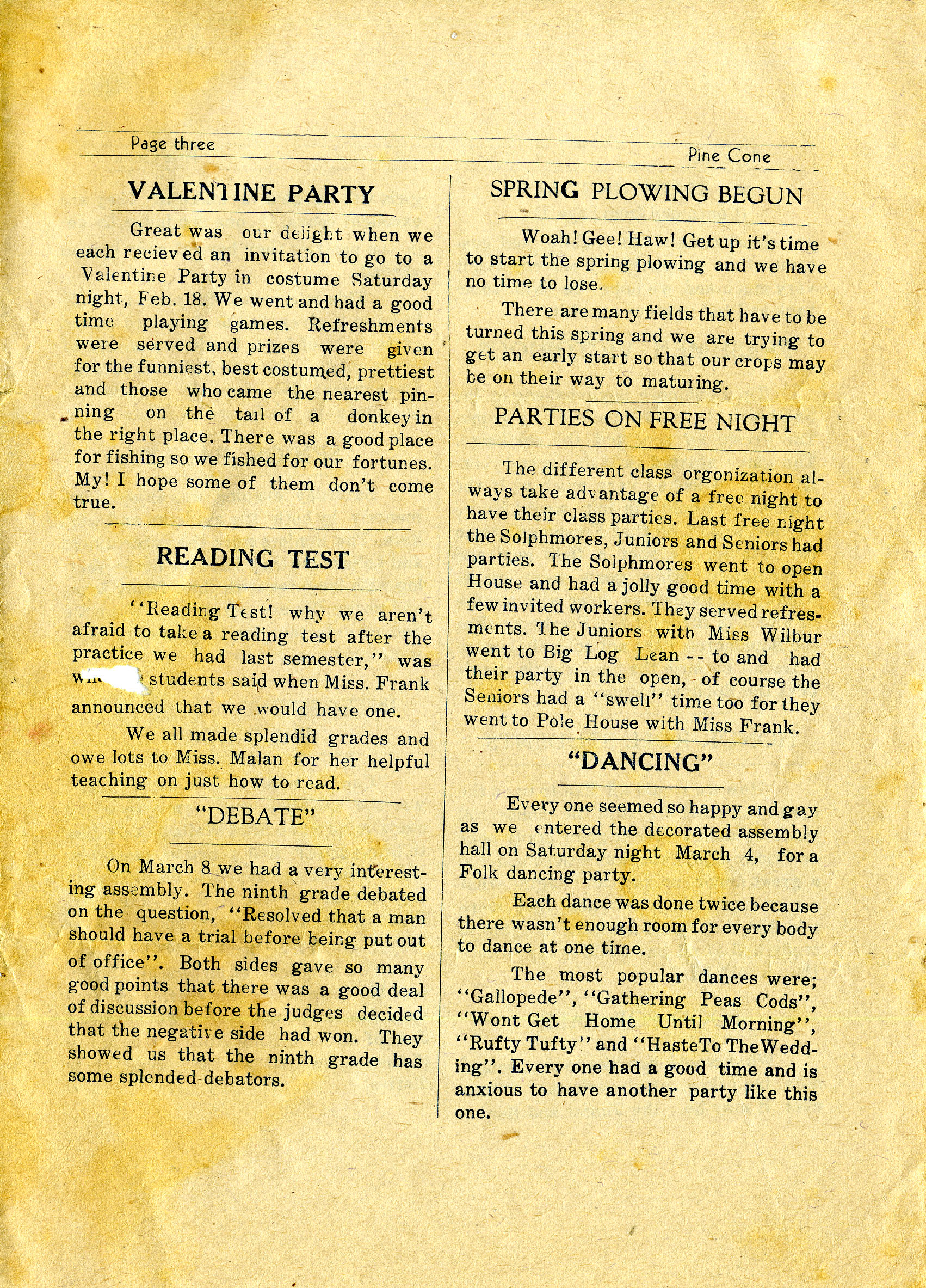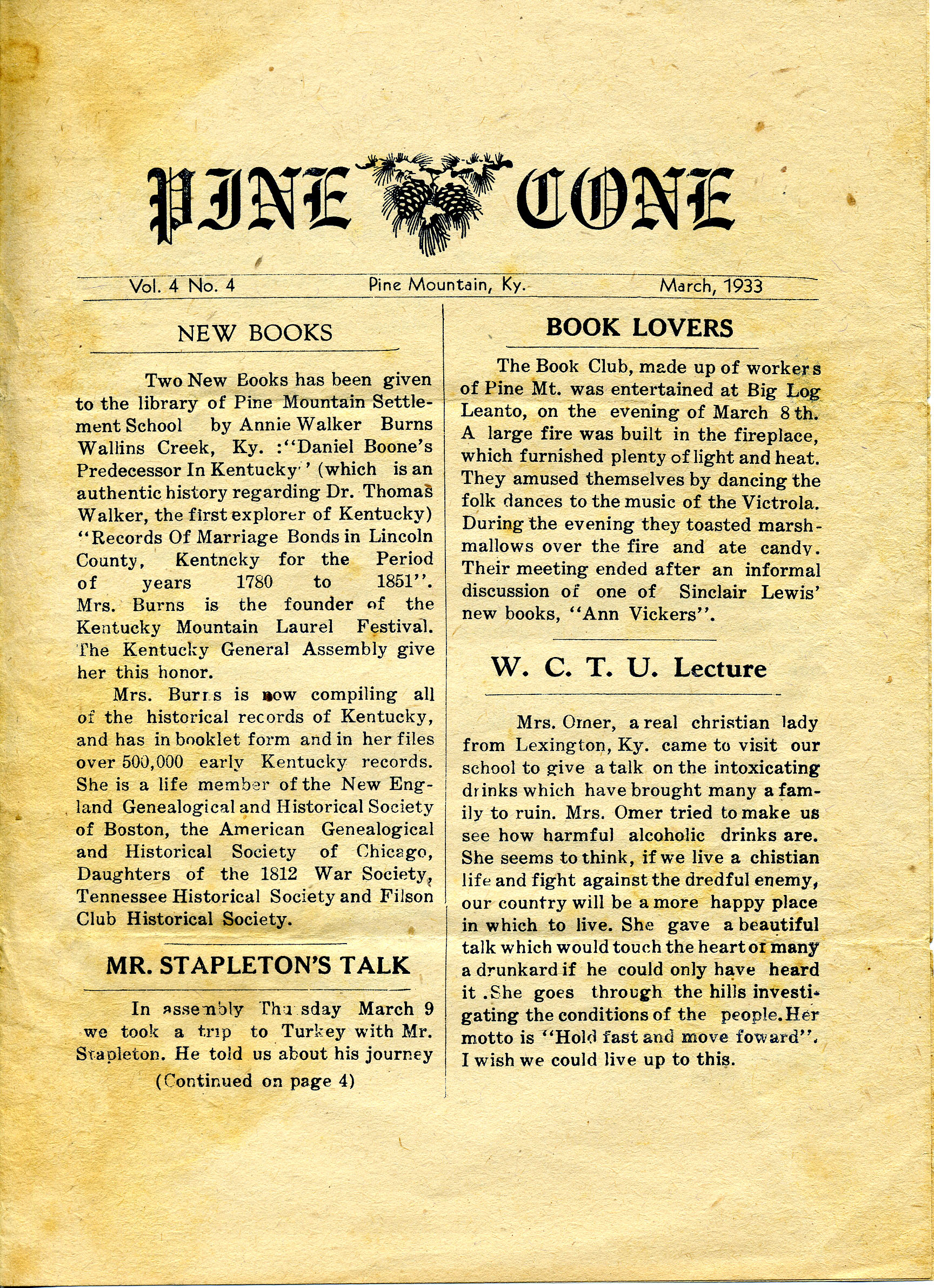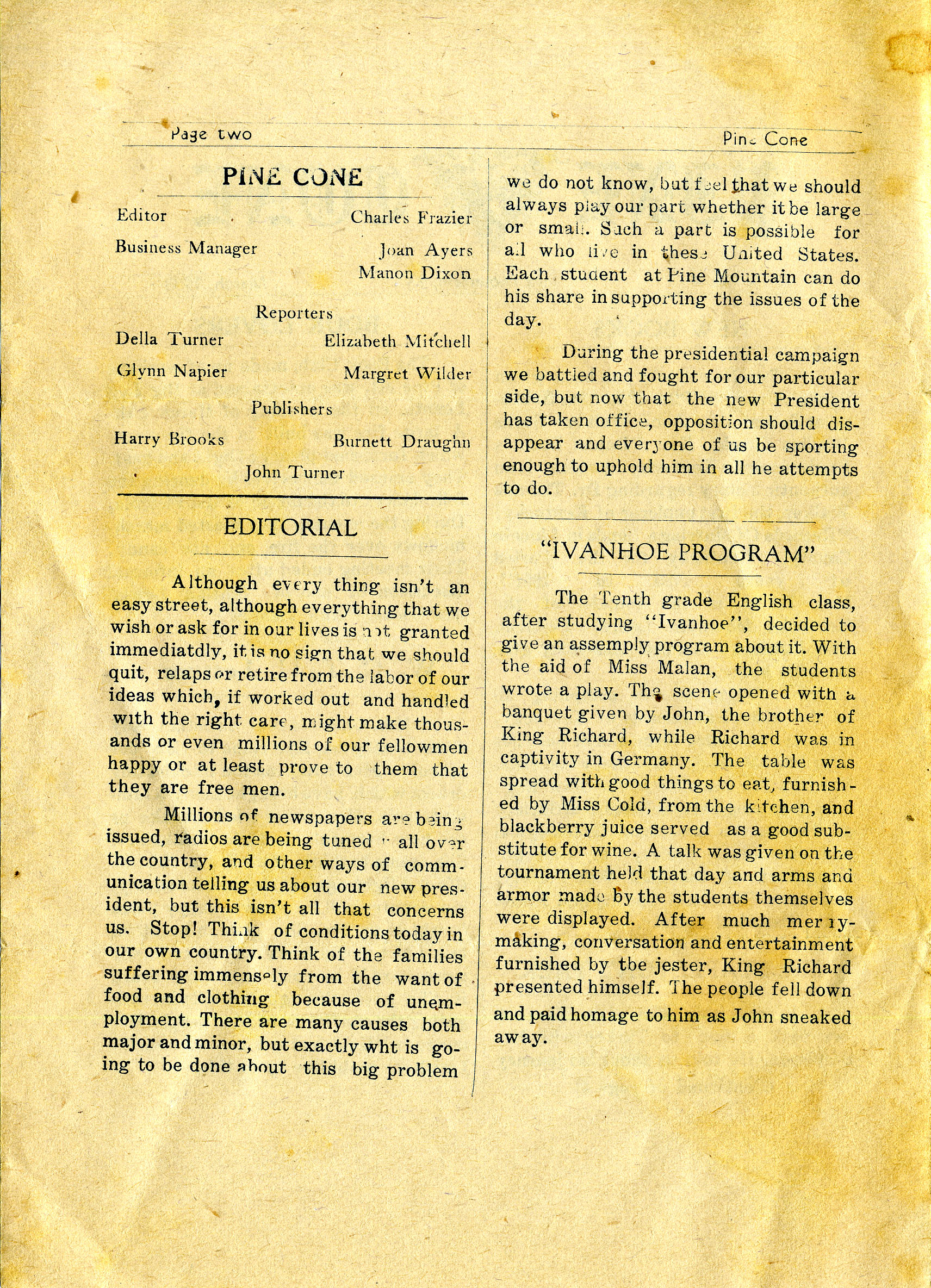 TAGS: Pine Cone 1933 March, student writing, student activities, Book Club, talks, editorials, Ivanhoe program, parties, dancing, campus activities