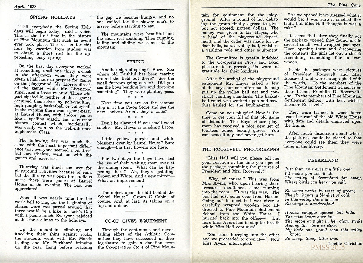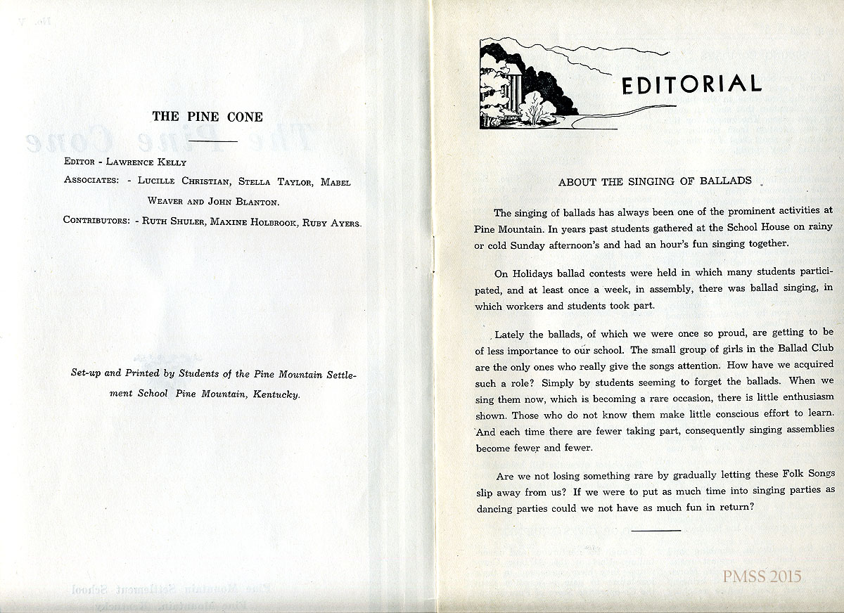 Front Cover: “Vol. V, No. V. The Pine Cone, Pine Mountain Settlement School, Pine Mountain, Kentucky”