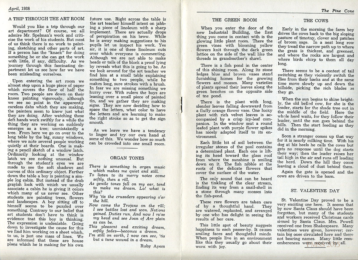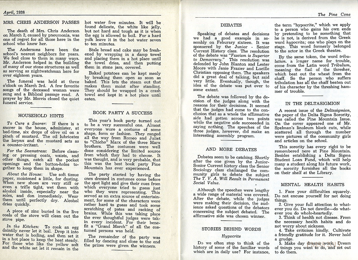 TAGS: Pine Cone 1938 April, student writings, student activities, Roosevelt photographs, community & campus news, book party, debates, Delta Sigma