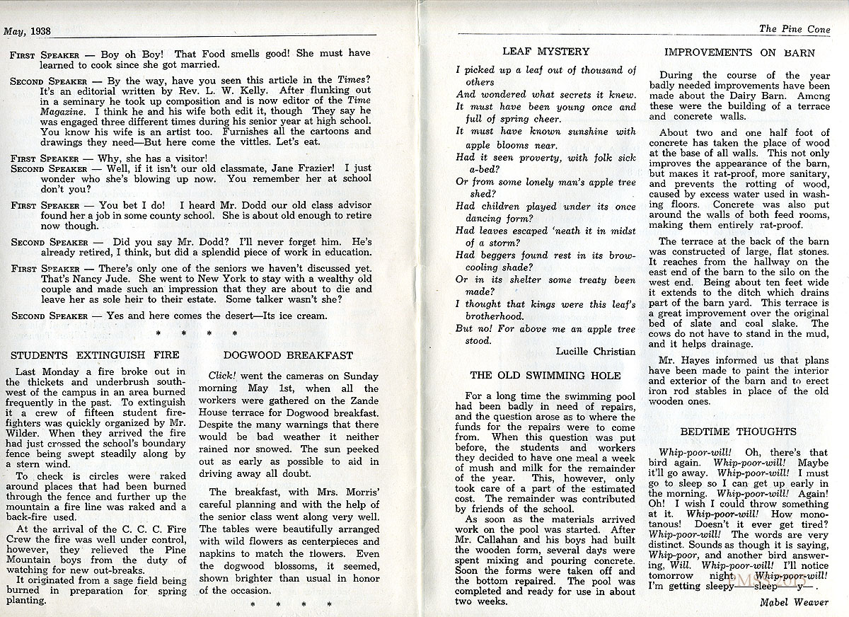 TAGS: Pine Cone 1938 May, student writings, senior class photos & articles, fire-fighting, Dogwood Breakfast, poems, narratives