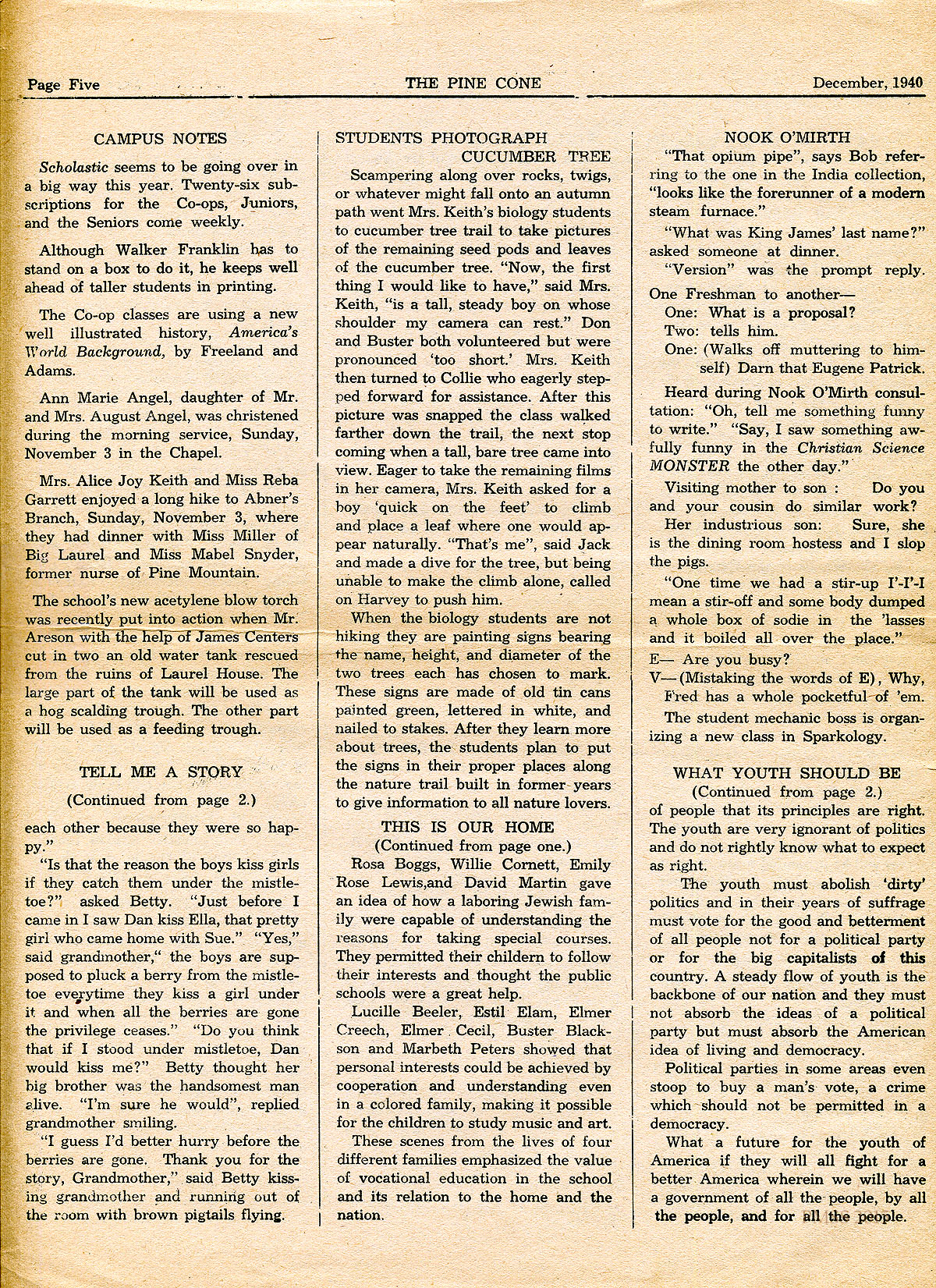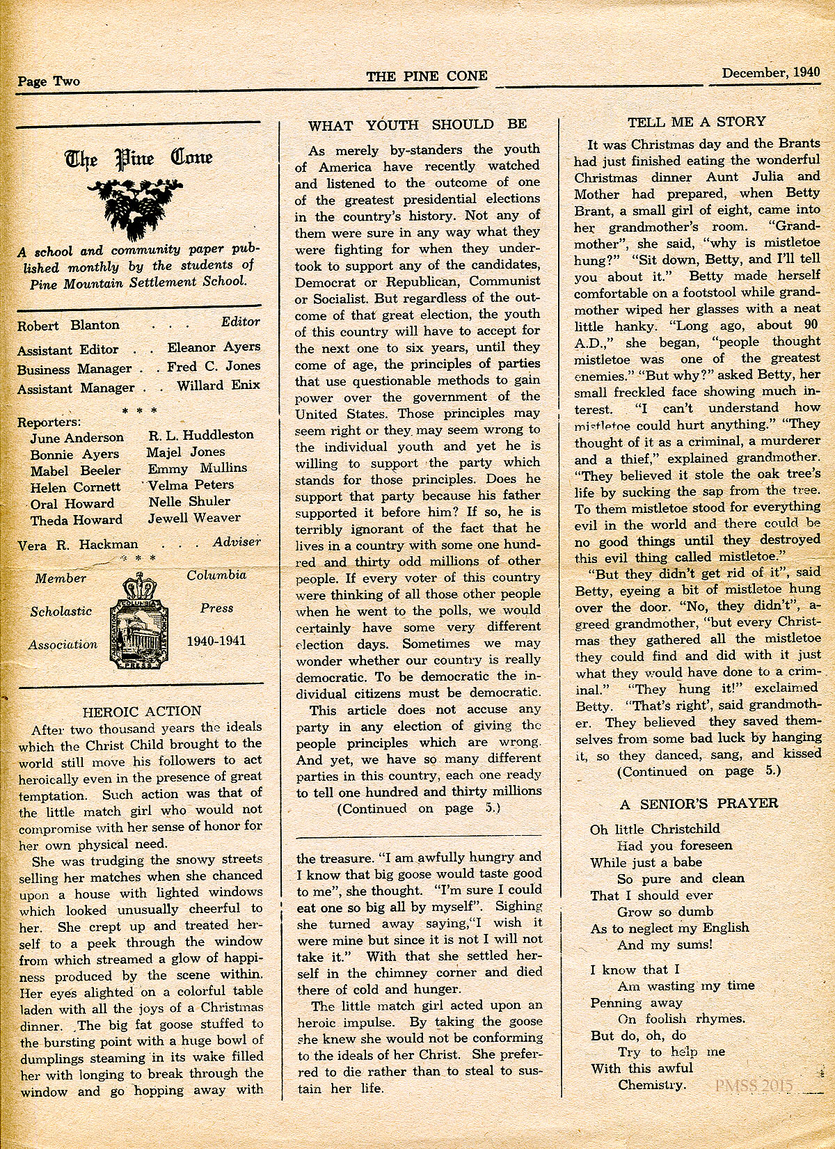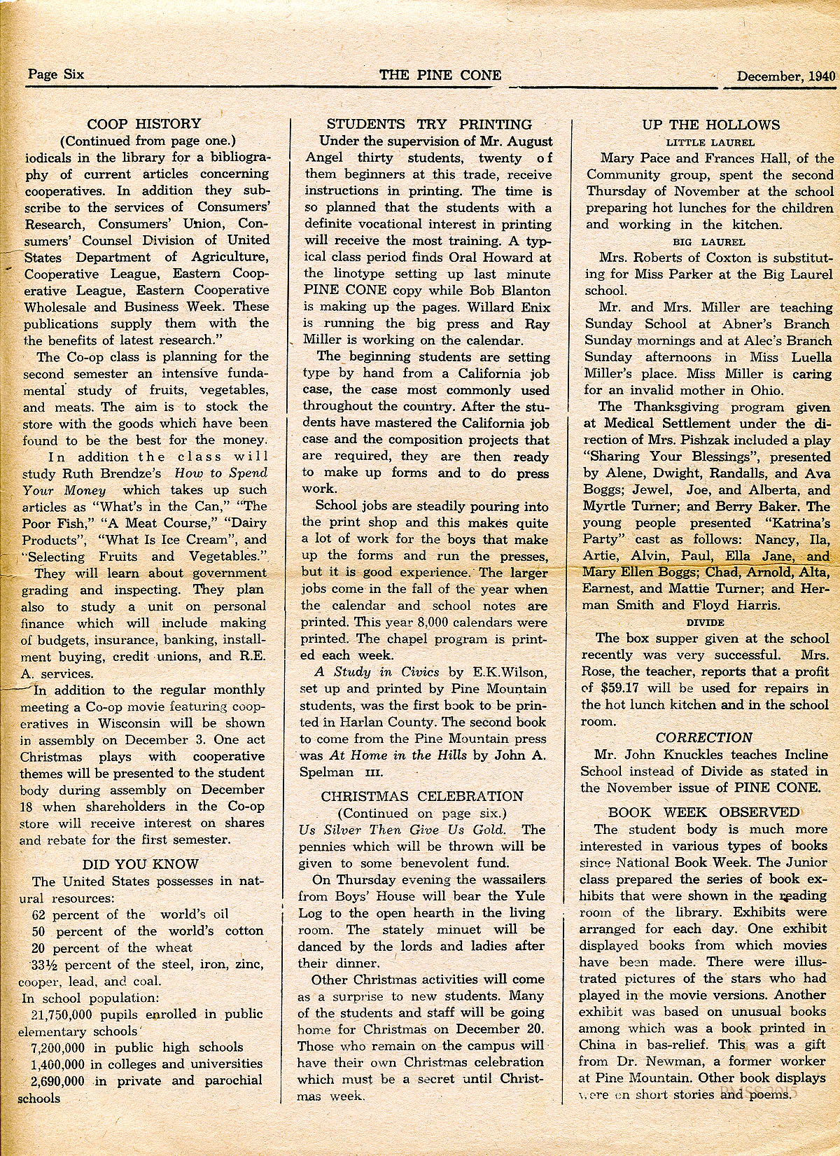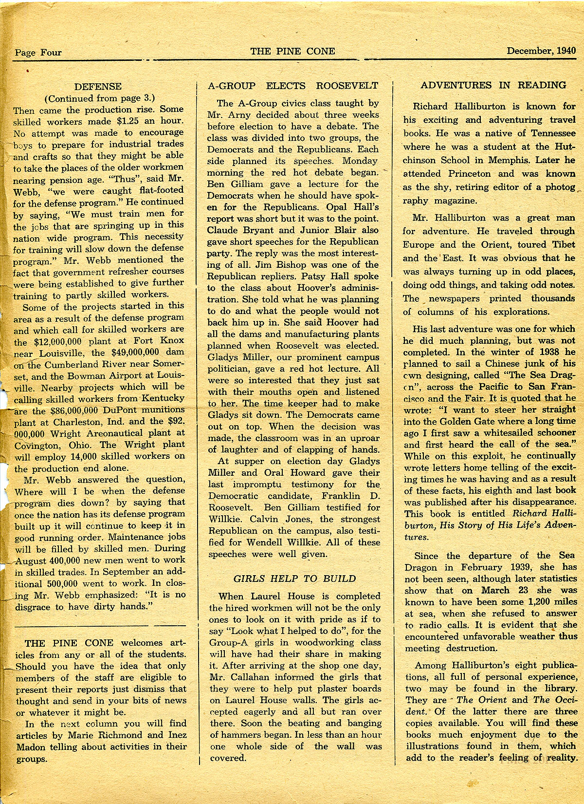 TAGS: Pine Cone 1940 December, student writings, Laurel House II, Christmas activities, essays, poems, WWII, campus activities, debates, co-op, print shop, community news