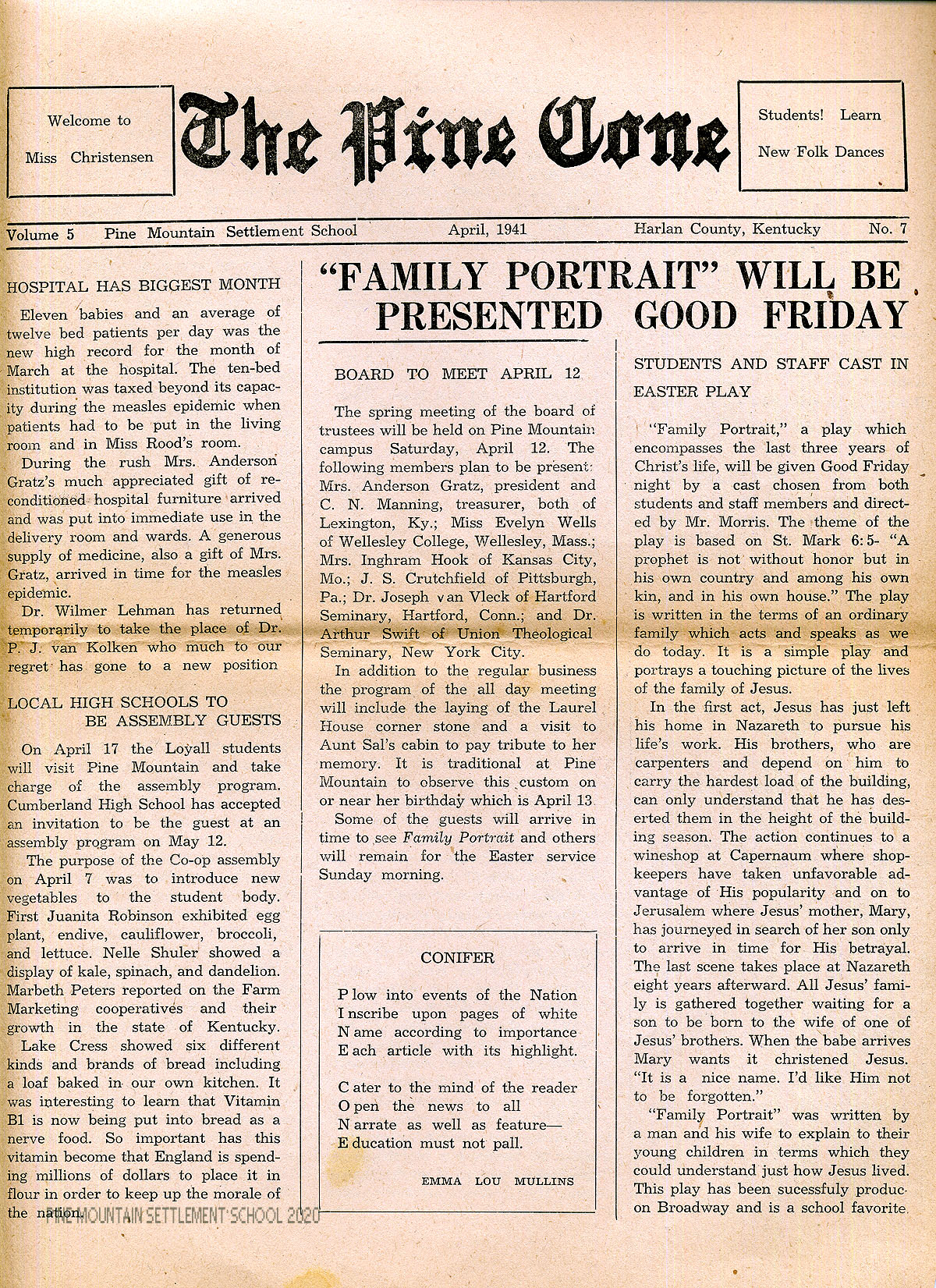 TAGS: Pine Cone 1941 April, student writings, student activities, board of directors,  campus news, community news, poems, visitors