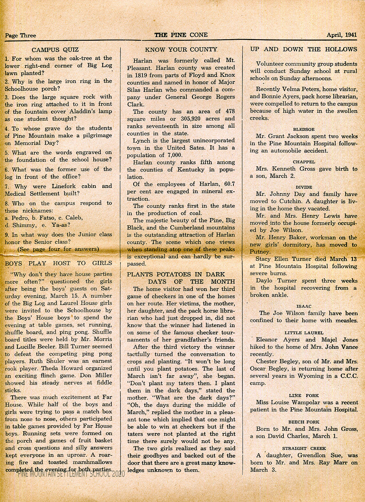 THE PINE CONE – “A school and community paper published monthly by the students of Pine Mountain Settlement School.”