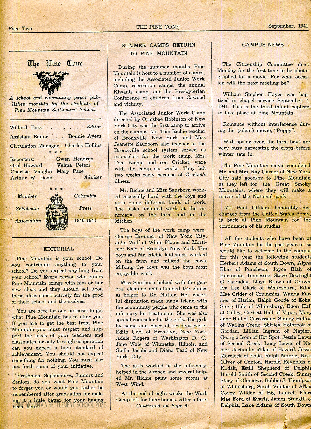 TAGS: The Pine Cone 1941 September, new students, new workers, Community Day, filming, Mr. and Mrs. Ray Garner, cooperatives, Harmon Foundation, weddings, summer camps, book donations, Infirmary, sports, teacher training films, D.A.R., Southern Mountain Workers