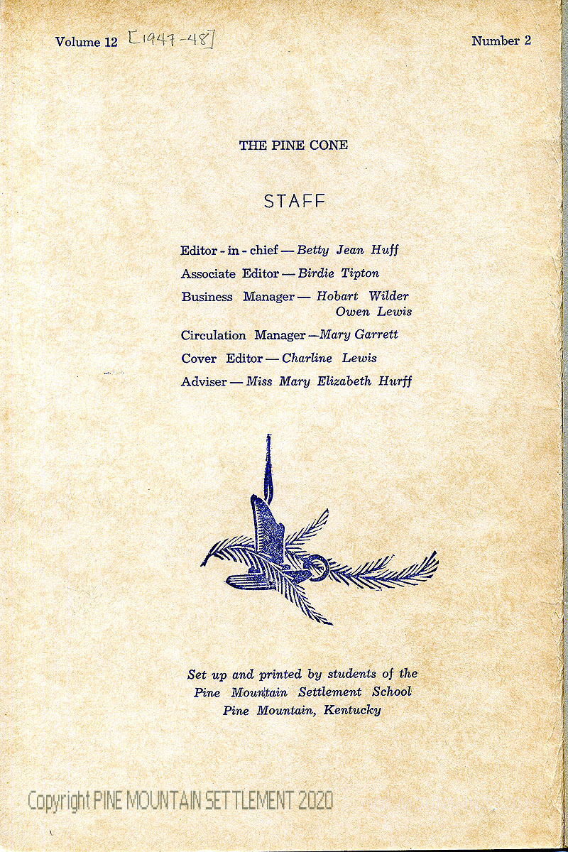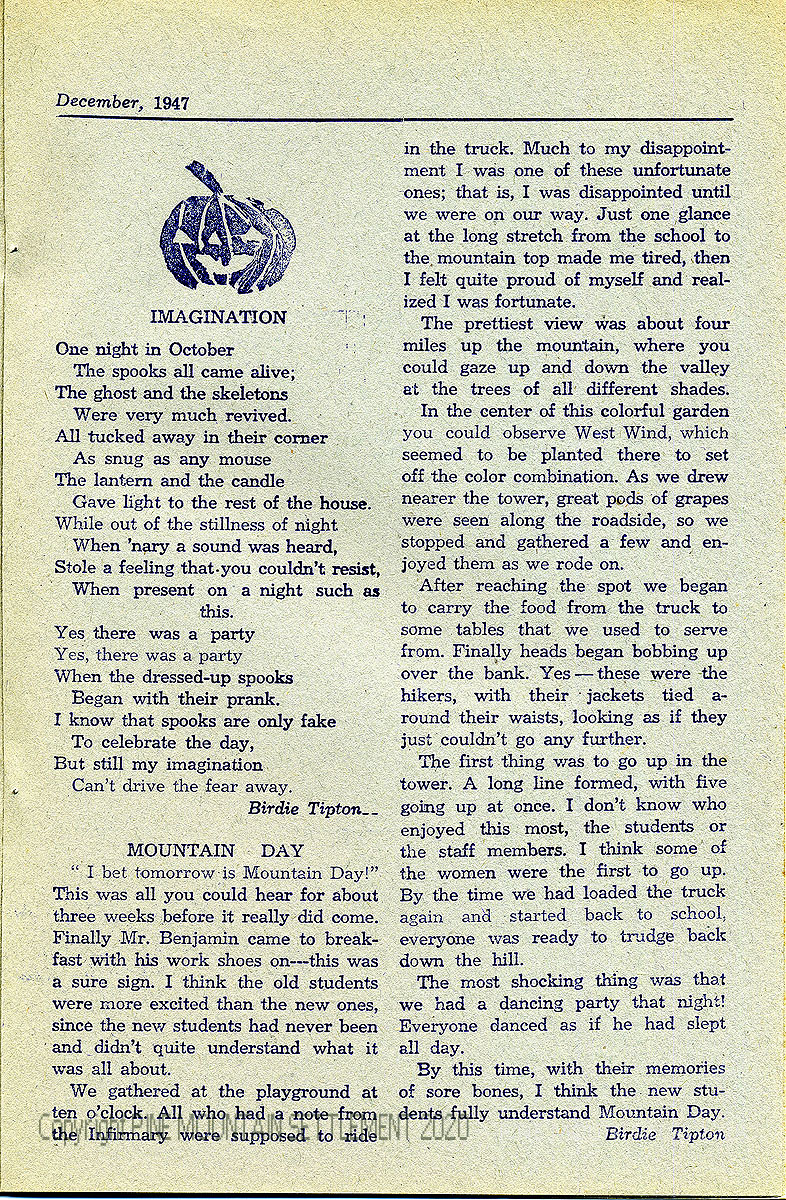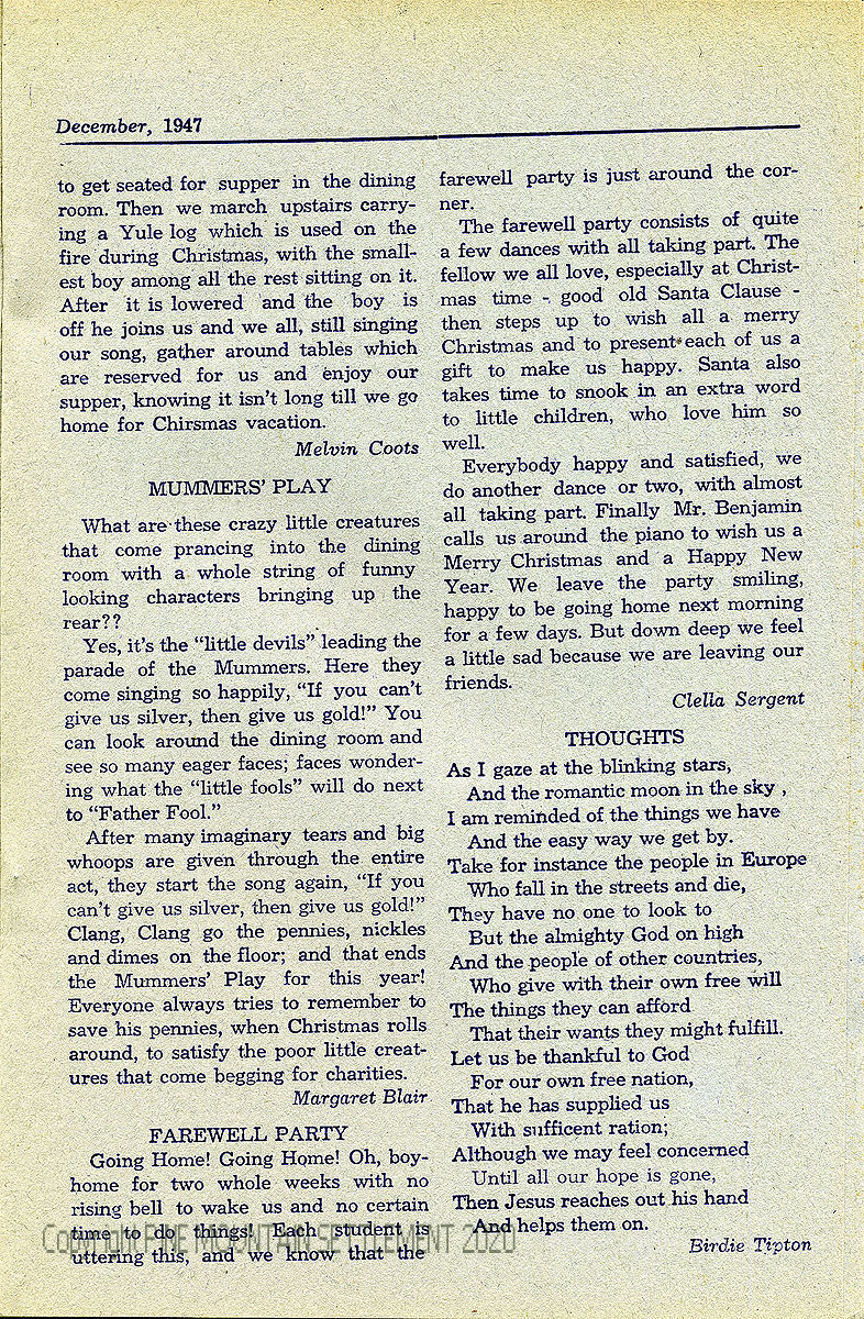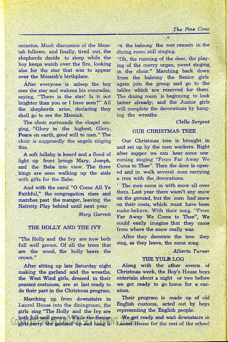 TAGS: The Pine Cone 1947 December, student writings, campus activities, Christmas at PMSS, Farewell Party, Infirmary, new staff, poetry, Mountain Day