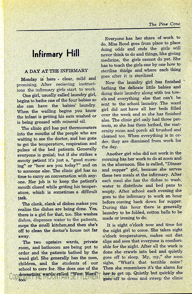 Infirmary Hill – A DAY AT THE INFIRMARY: Describes the work of the infirmary girls: the laundry girl, the clinic girl, dish girl, ward girl, “dinner and supper girl,” and night girl; Miss [Grace] Rood’s duties.