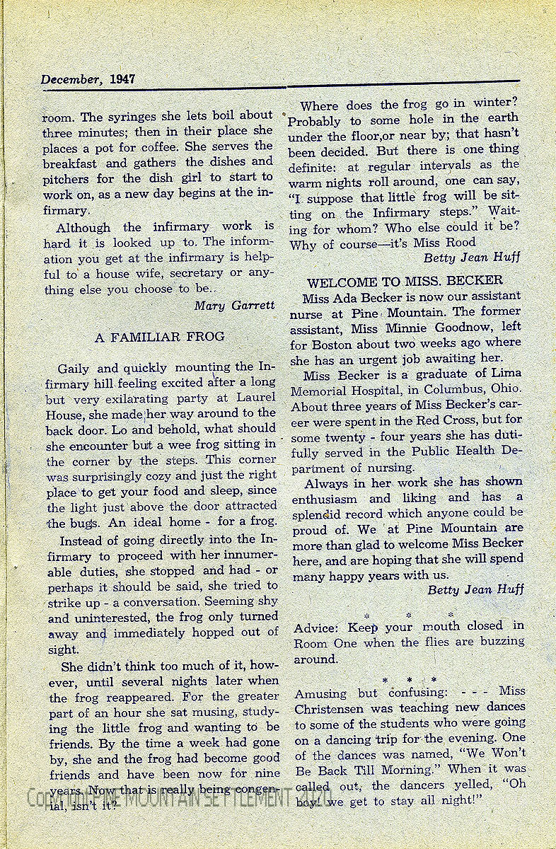 A FAMILIAR FROG by Betty Jean Huff – Describes years of regular encounters with a frog at the back door of the Infirmary.