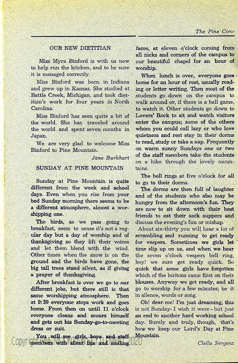 SUNDAY AT PINE MOUNTAIN by Clella Sergent – chapel worship, afternoon activities, sack suppers, vespers.