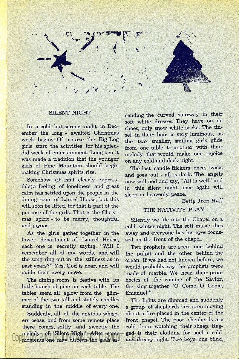 SILENT NIGHT by Betty Jean Huff – Christmas week at Pine Mountain begins with Big Log girls singing Silent Night in a decorated Laurel House.