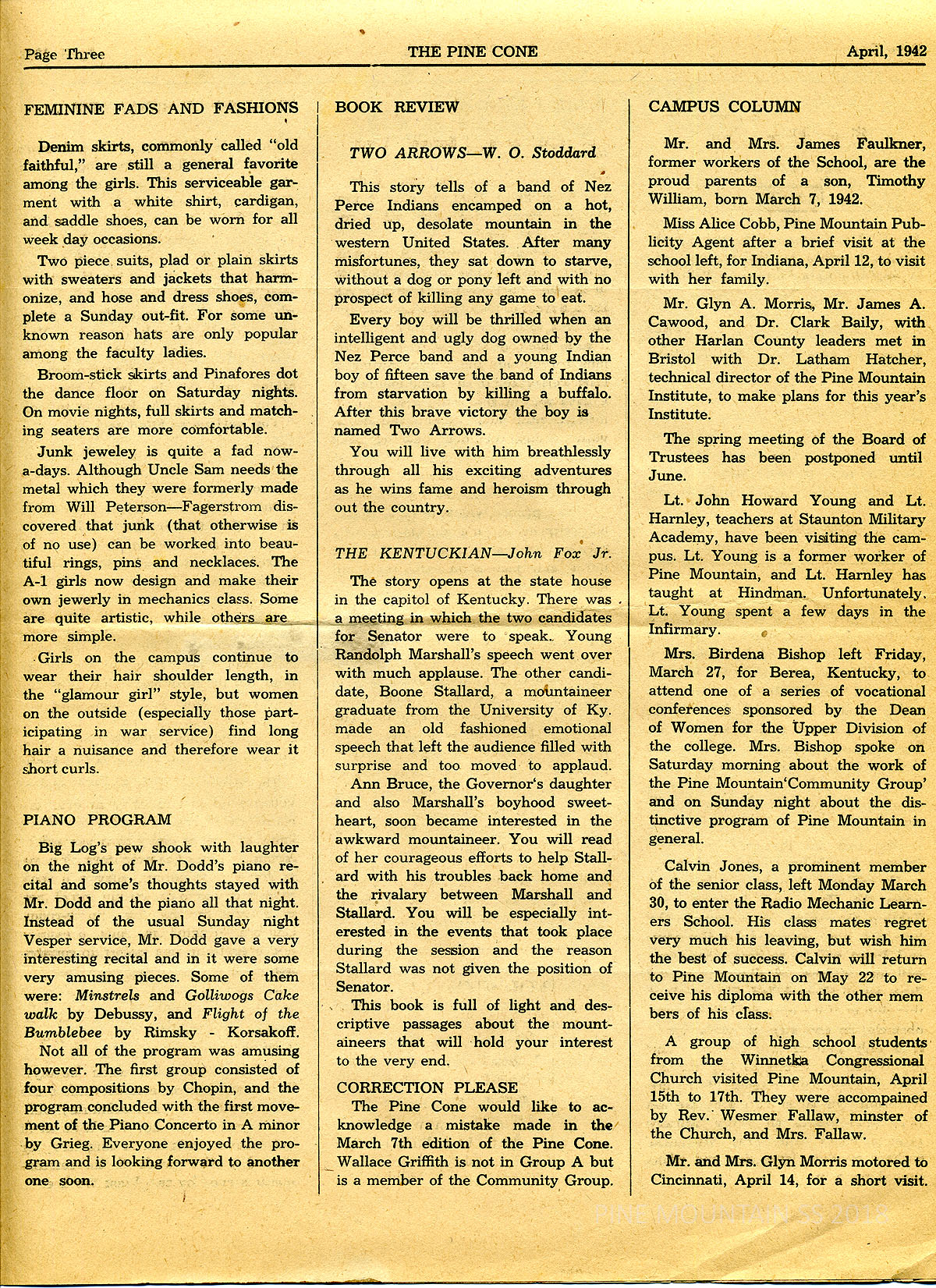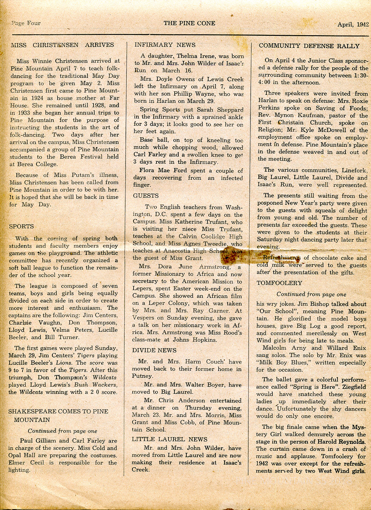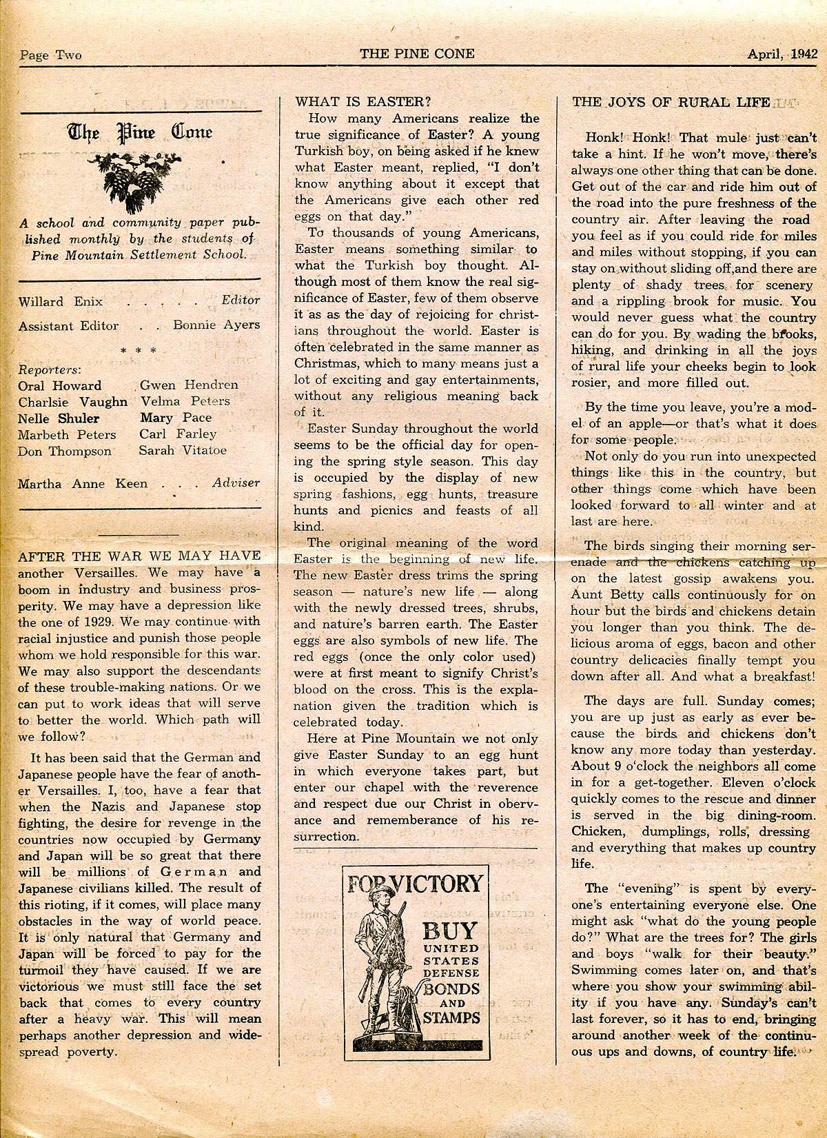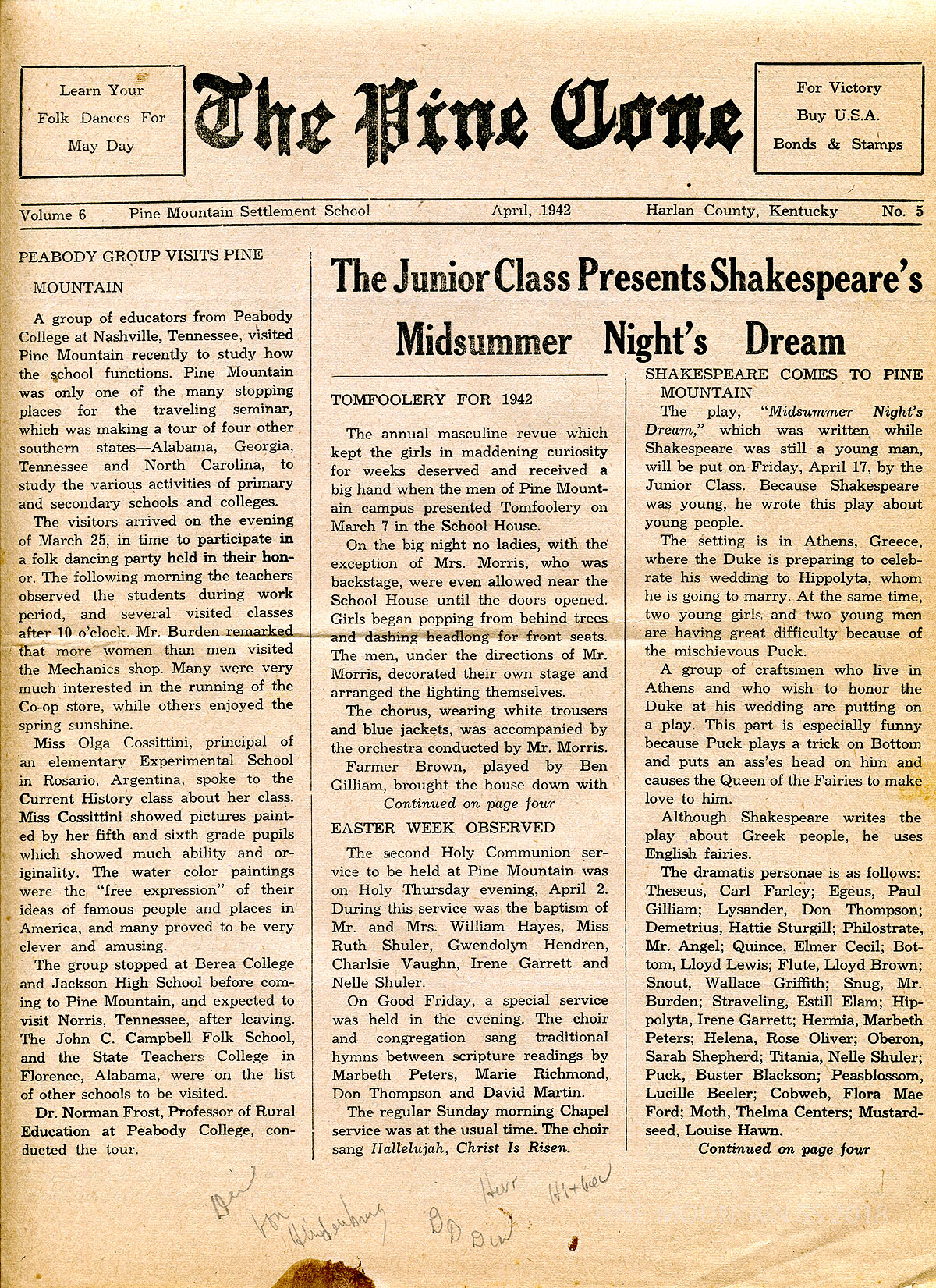 THE PINE CONE – “A school and community paper published monthly by the students of Pine Mountain Settlement School.”
