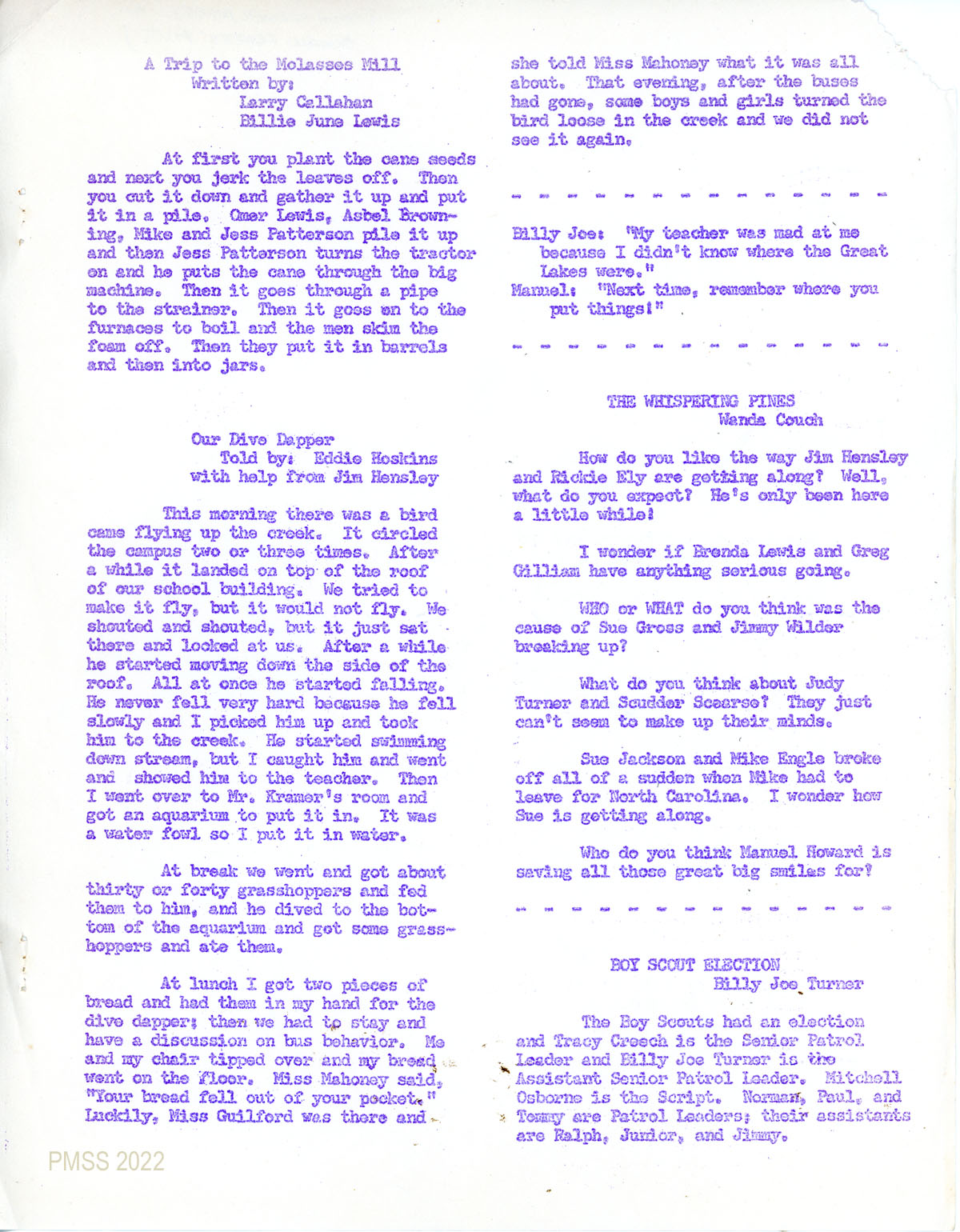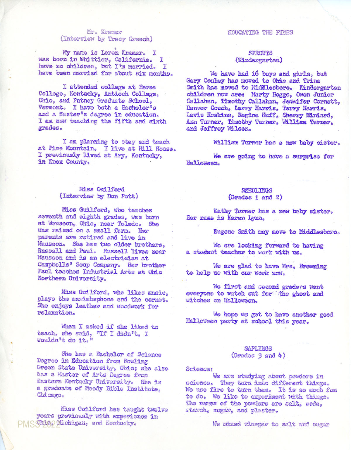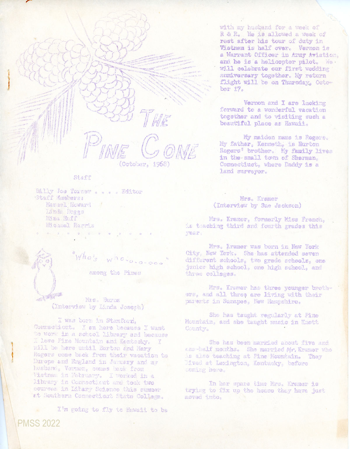 TAGS: The Pine Cone 1968, newsletters, Pine Mountain Settlement School, teachers, students, Community School, Loren Kramer, Loren W. Kramer, Atossa “Toppy” Kramer, Nancy Sather, biographies, creative writing, English classes, grade school classes