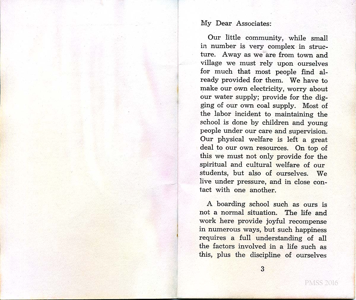 Our little community, while small in number is very complex in structure. Away as we are from town and village we must rely upon ourselves for much that most people find already provided for them. We have to make our own electricity, worry about our water supply; provide for the digging of our own coal supply. Most of the labor incident to maintaining the school is done by children and young people under our care and supervision. Our physical welfare is left a great deal to our own resources. On top of this, we must not only provide for the spiritual and cultural welfare of our students, but also of ourselves. We live under pressure, and in close contact with one another.
