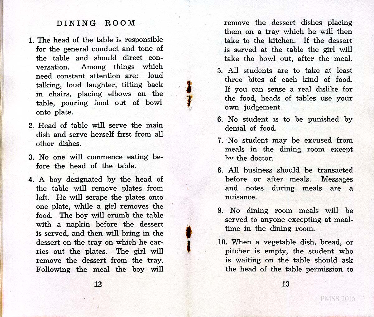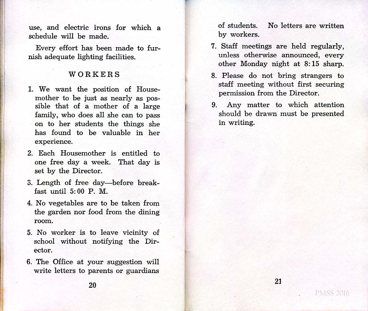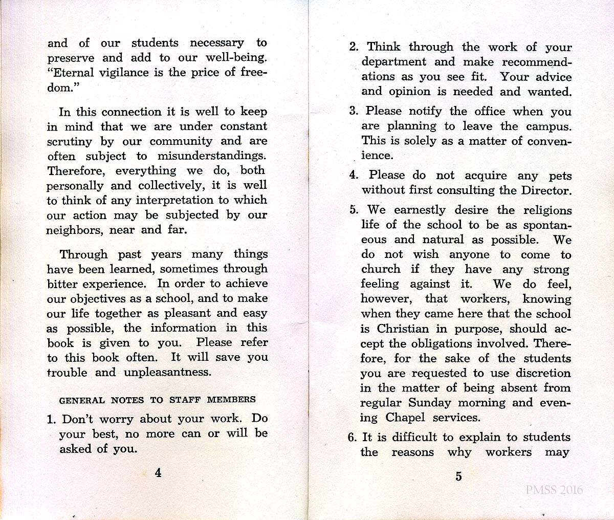TAGS: PMSS Black Book, rules and regulations, isolation, student labor, boarding school, students, personnel, discipline, community, staff input, church attendance, smoking, firearms, confidentiality, schedules, campus absences, guests, duties and responsibilities, discretion, interacting with students, procedures for student admittance, dining room etiquette