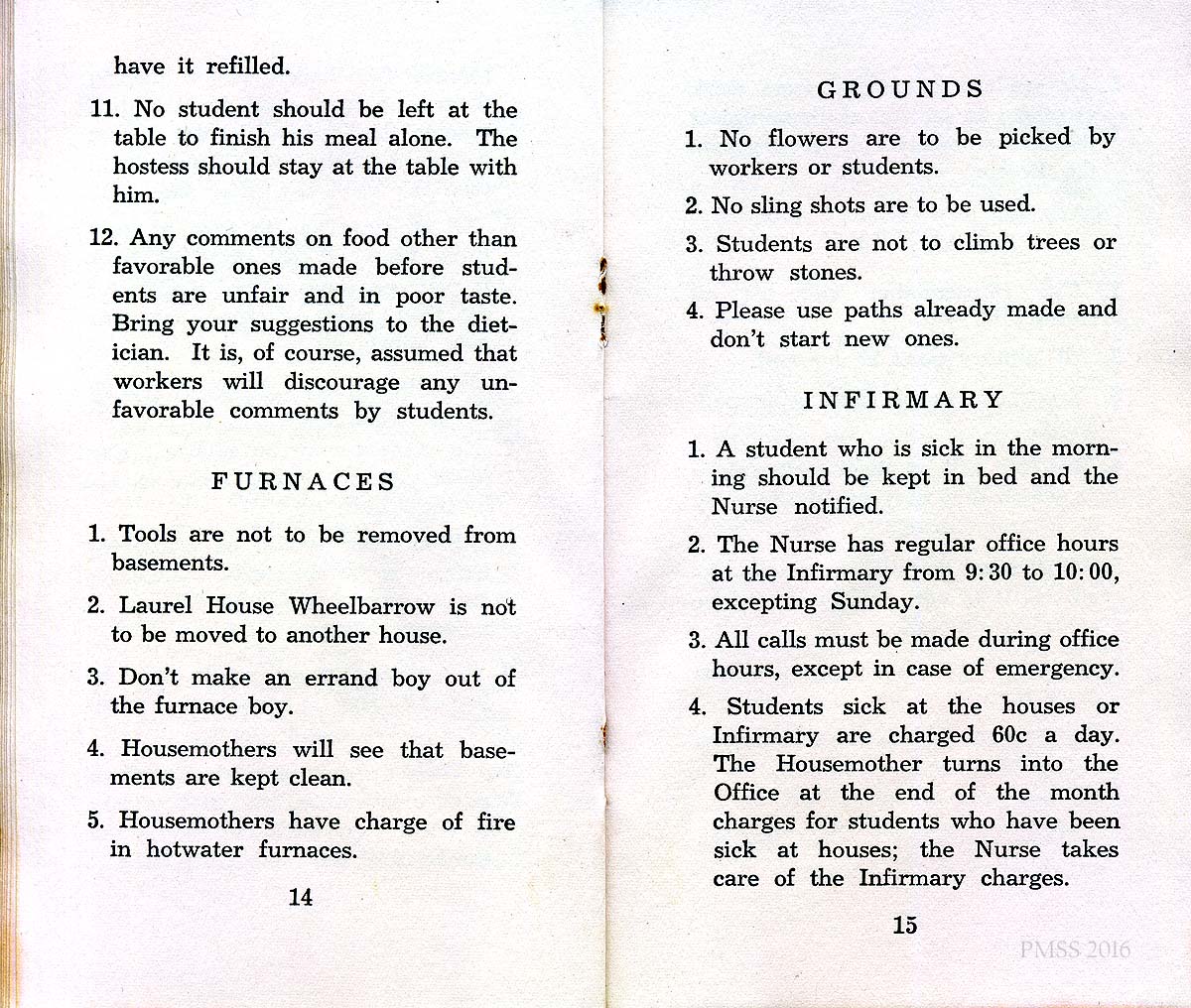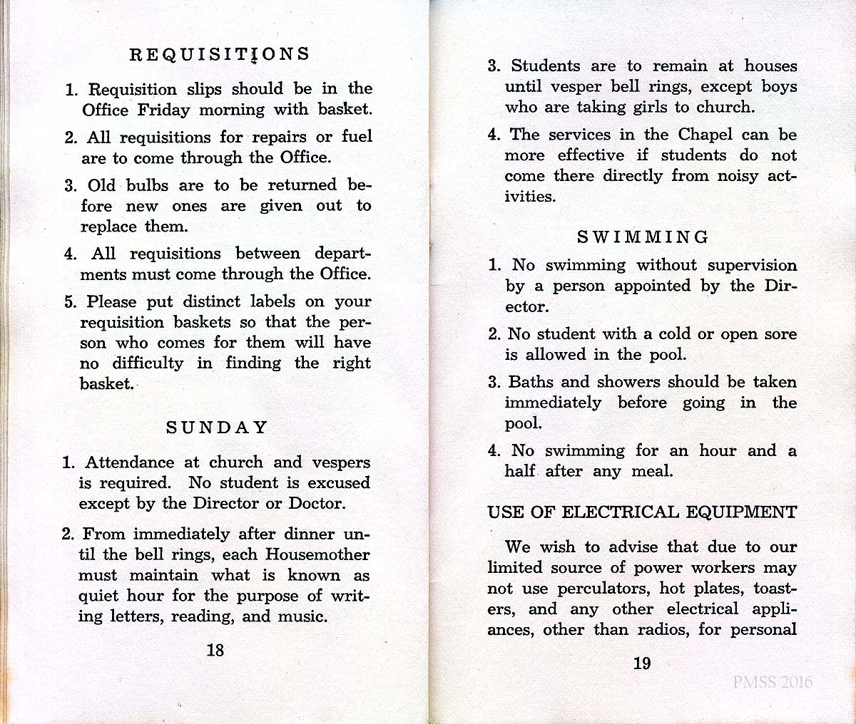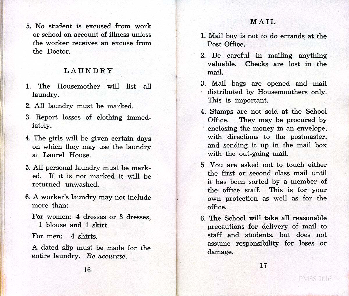 TAGS: PMSS Black Book, rules and regulations, isolation, student labor, boarding school, students, personnel, discipline, community, staff input, church attendance, smoking, firearms, confidentiality, schedules, campus absences, guests, duties and responsibilities, discretion, interacting with students, procedures for student admittance, dining room etiquette