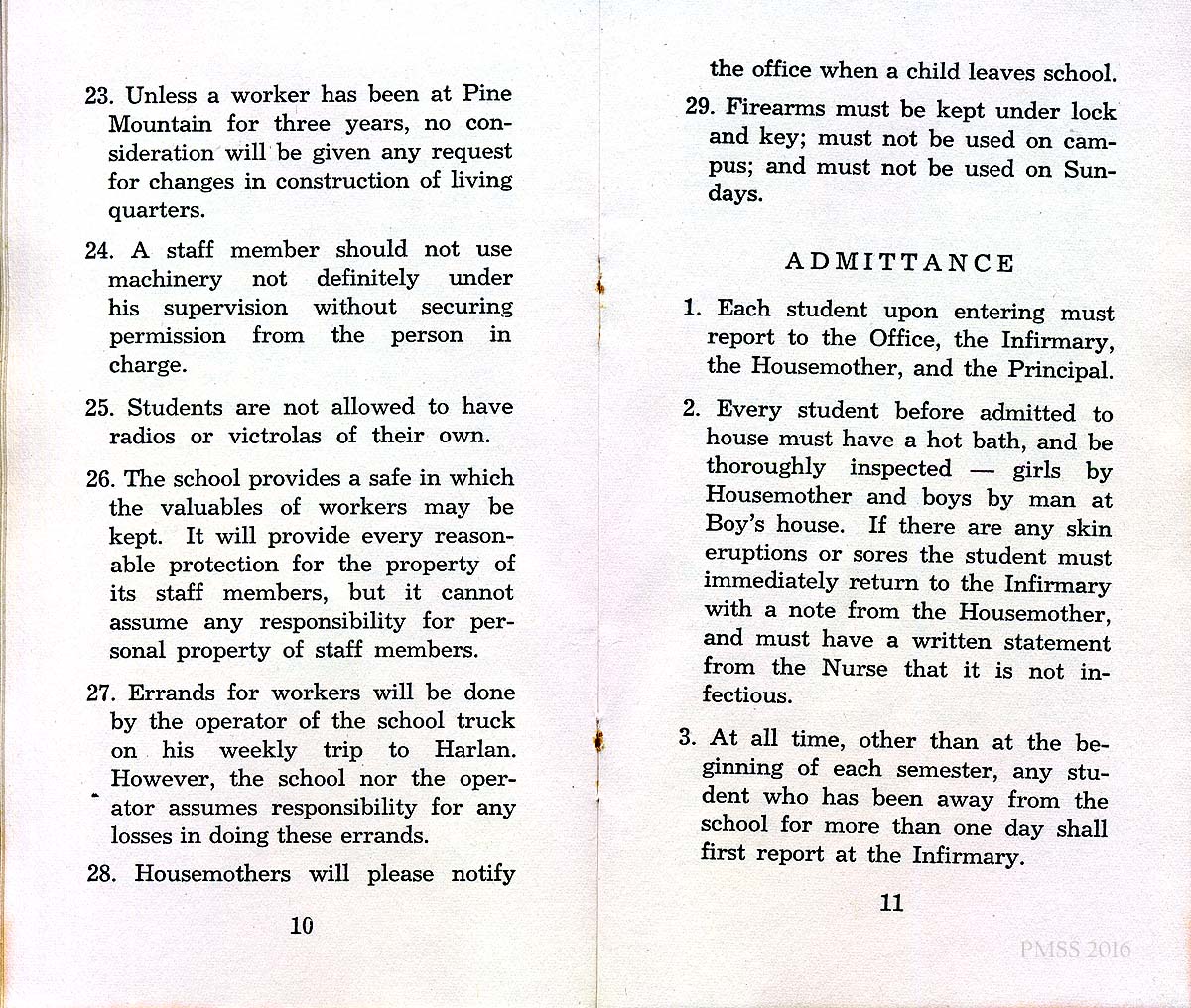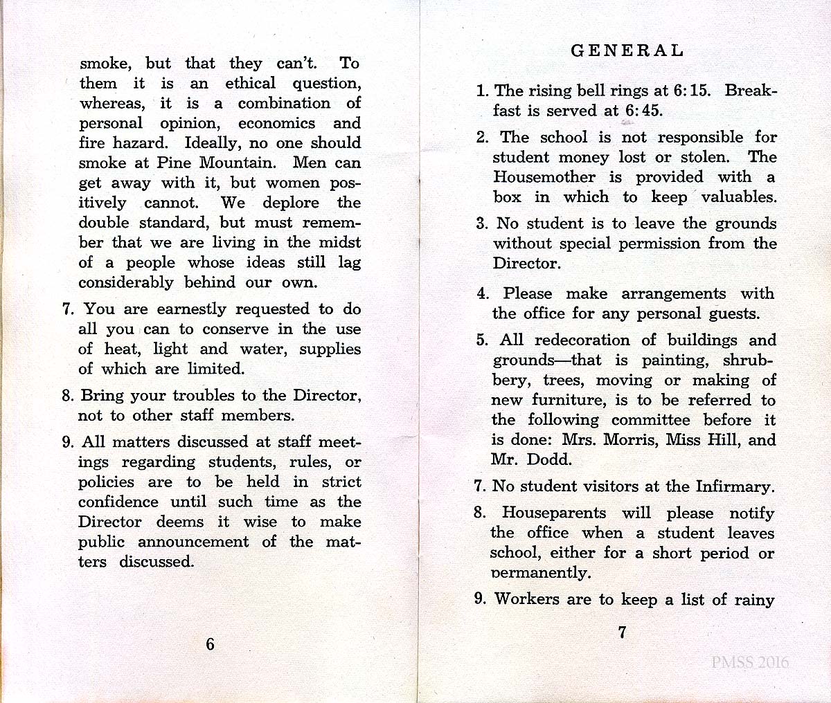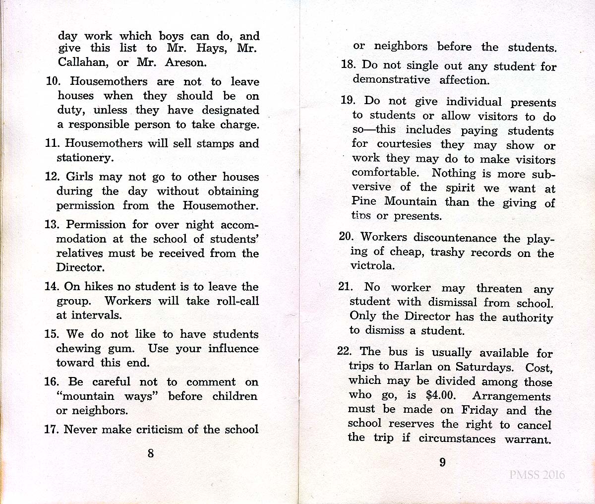 19. Do not give individual presents to students or allow visitors to do so — this includes paying students for courtesies they may show or work they may do to make visitors comfortable. Nothing is more subversive of the spirit we want at Pine Mountain than the giving of tips or presents.