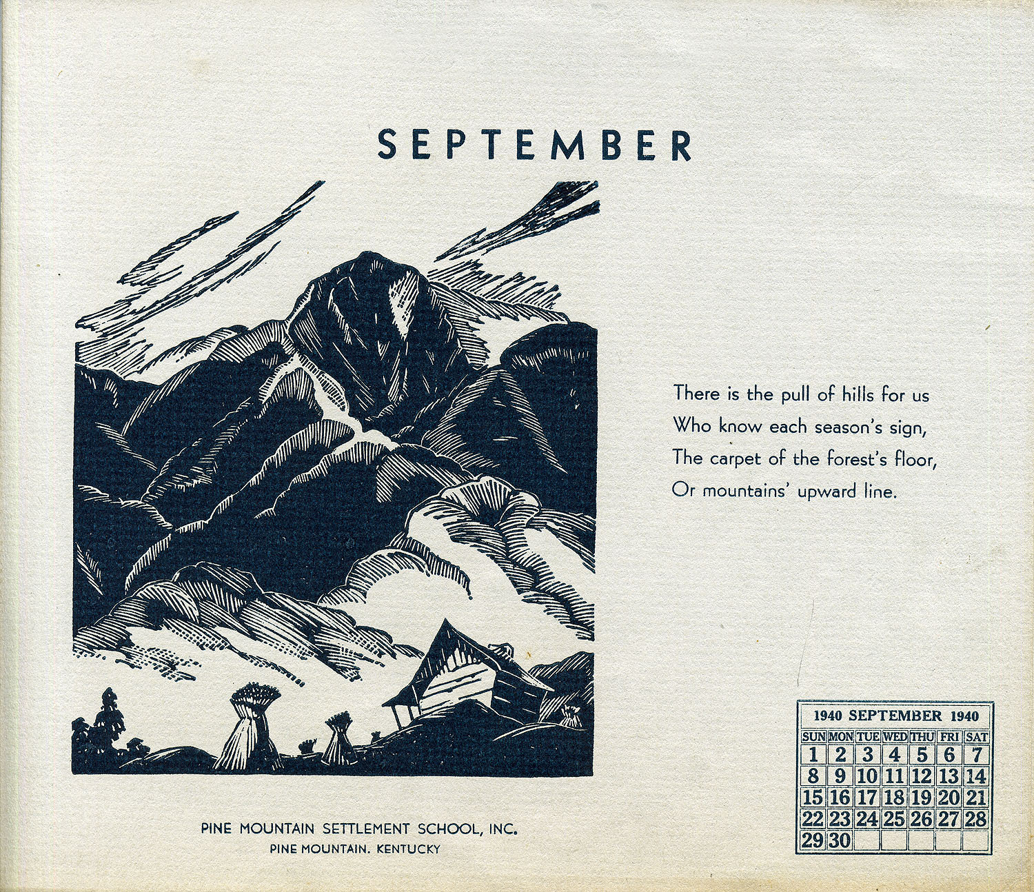 - 1940 Calendar. Linoleum prints by John Spelman III. September