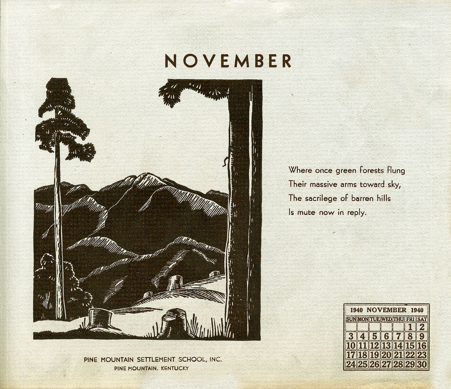 - 1940 Calendar. Linoleum prints by John Spelman III. November