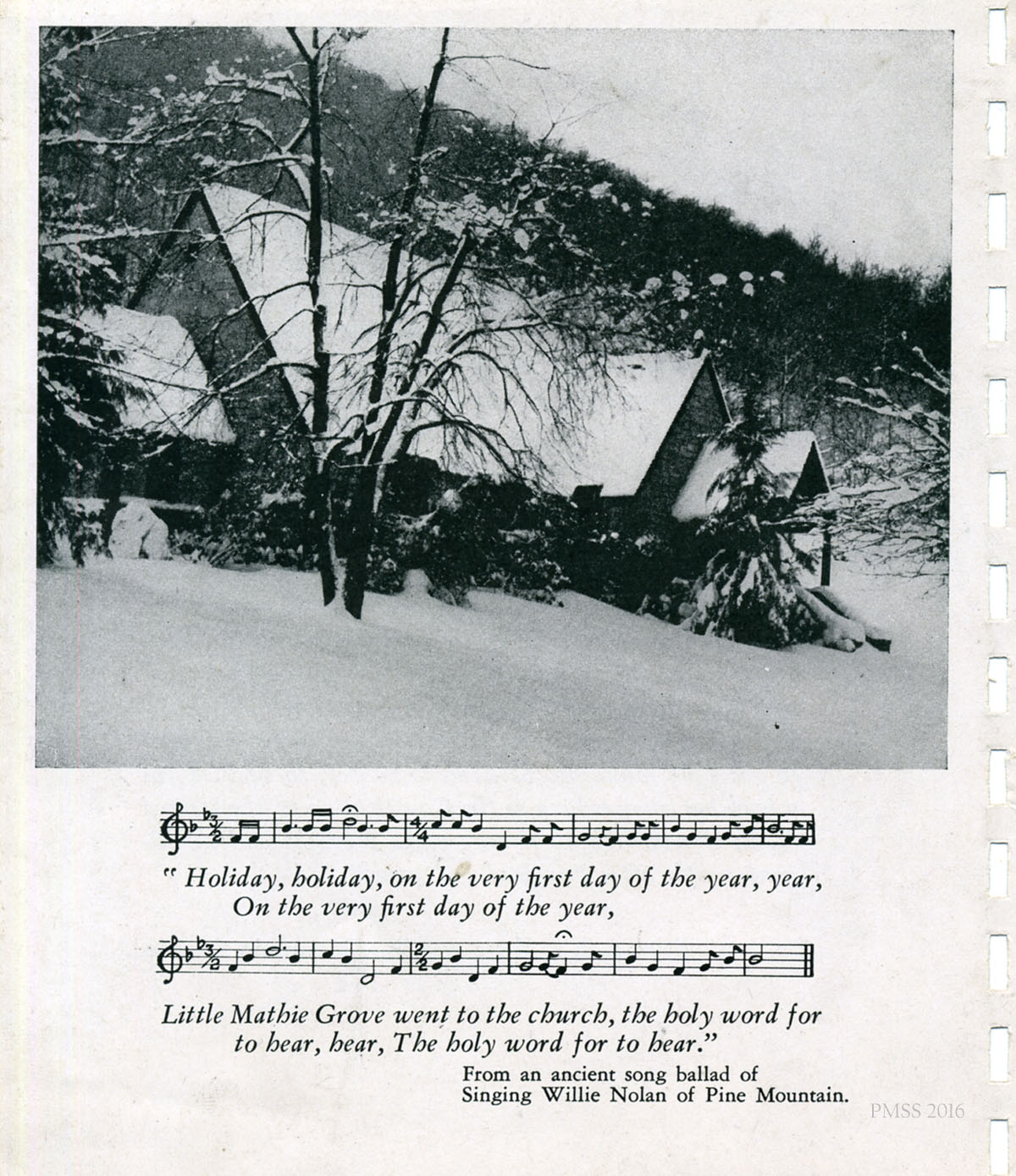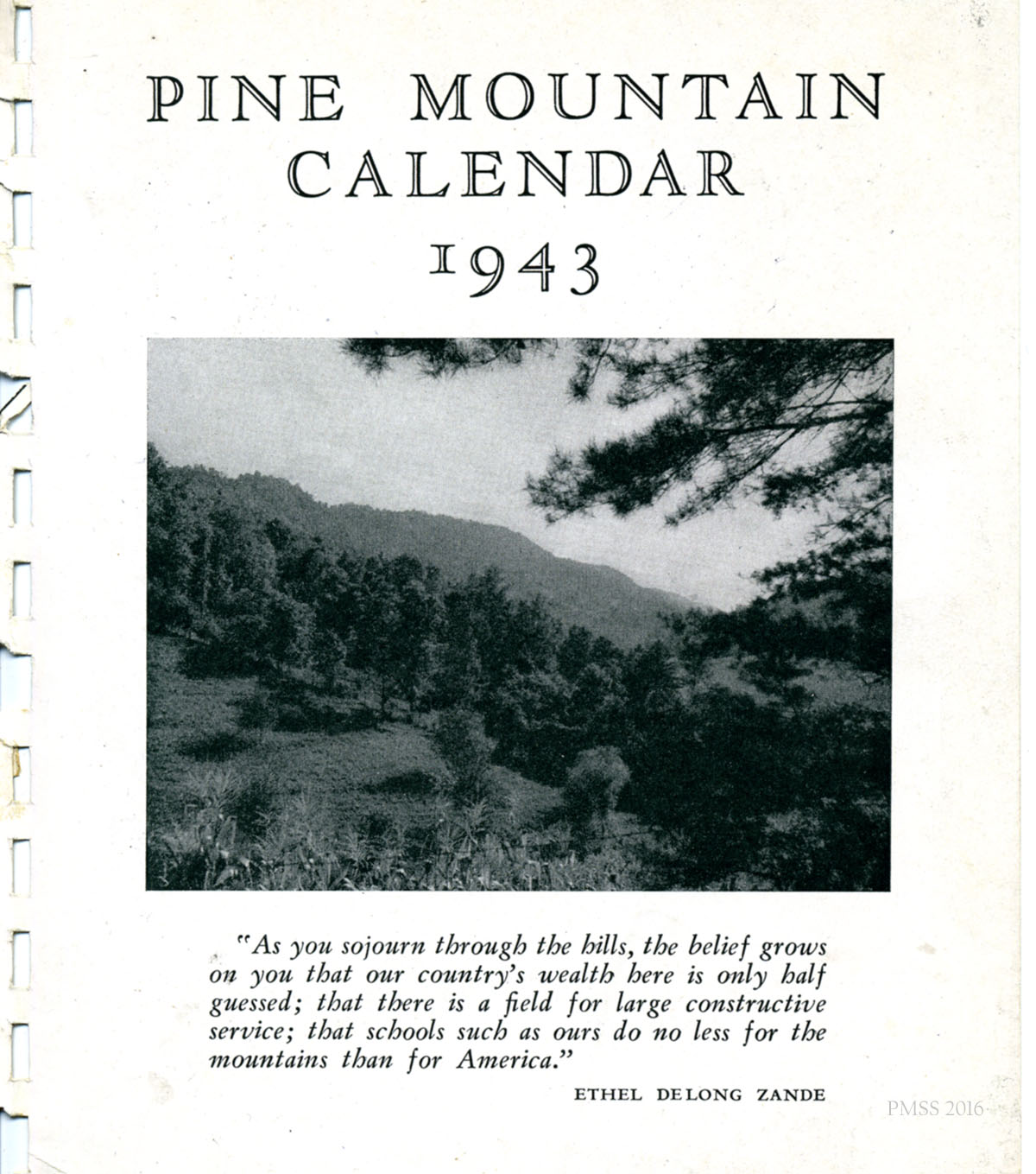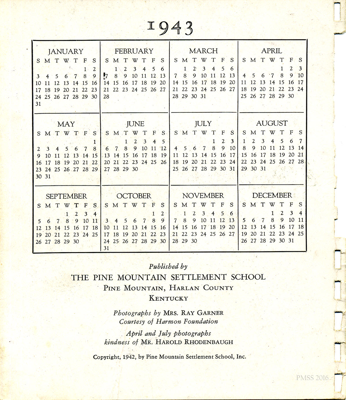 The 1943 spiral-bound calendar features quotes of the School founders as well as various photographs representing Pine Mountain Settlement School and the surrounding community in the early 1940s. The photographs are by Arthur Dodd, the staff photographer and principal and instructor at the School. During his tenure at the School, “Dodd,” as he was called, created many photographic images that were used in publicity and promotion of the institution.