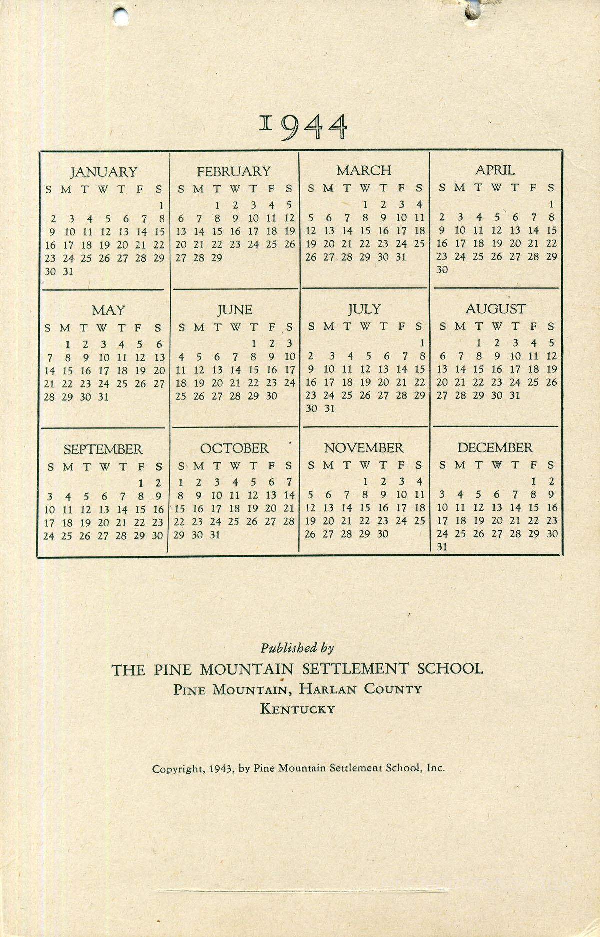 The 1944 Calendar resembles the 1943 Calendar, also the work of Arthur Dodd. Some photographs depict students in the School environment as well as scenes out in the community where the Settlement School practiced its outreach programs. The Community outreach program developed practical life skills as well as well as vocational training. The progressive program attracted a great deal of attention from national educators as well as government programs that were looking for ways to more fully engage rural communities and their students.