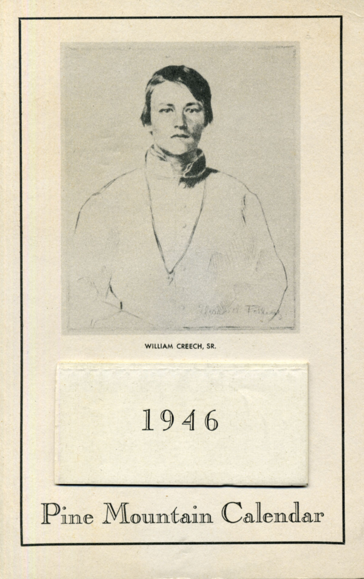 The 1946 PMSS Calendar is a small and very simple presentation of the exquisite engraving executed by Elisabeth Telling of a young William Creech. Telling took the image from Creech’s Civil War photograph. The image has long been an iconic image for Pine Mountain Settlement School and may be found on other promotional literature.