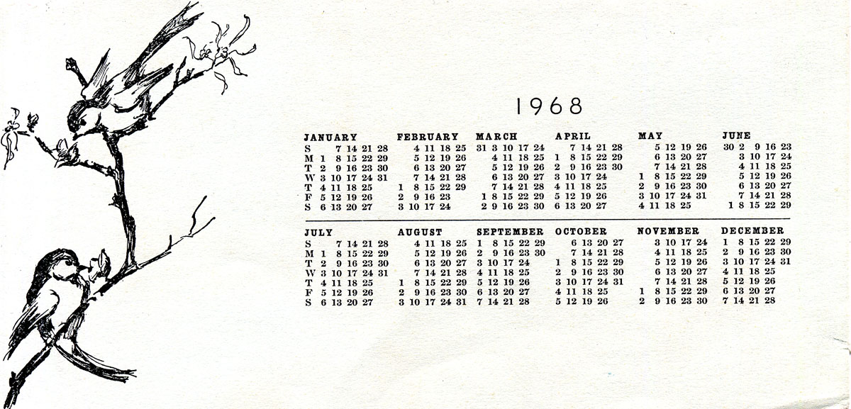 PMSS Calendar 1968, page 2. Drawing by Mary Rogers. [1968_calendar_002.jpg]